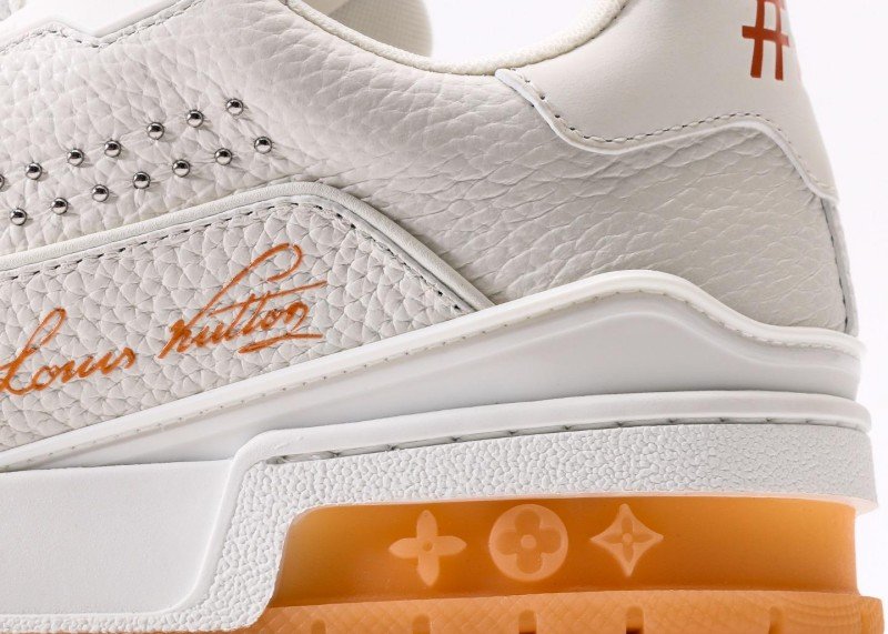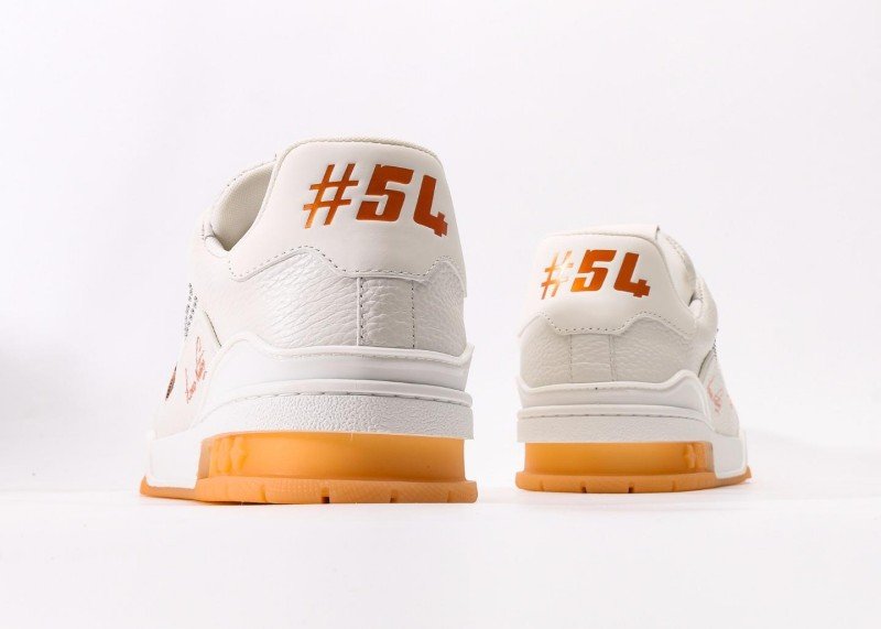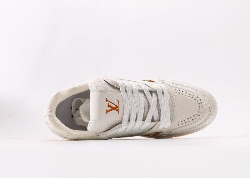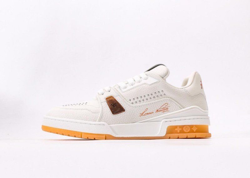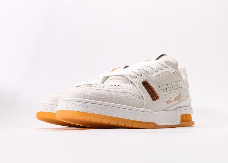 Louis Vuitton LV sneakers feature a white leather upper and orange transparent sole, adorned with handwritten “Louis Vuitton” logos on the sides and metal rivet decorations. The 5cm platform design subtly elongates leg lines, while the full authentic packaging includes a dust bag, authenticity card, and brand gift box to highlight luxury status.