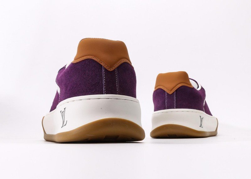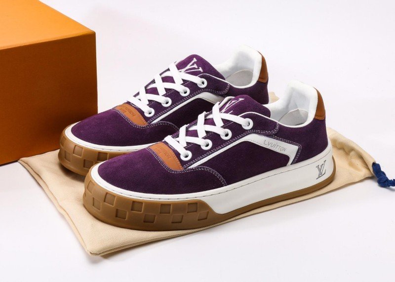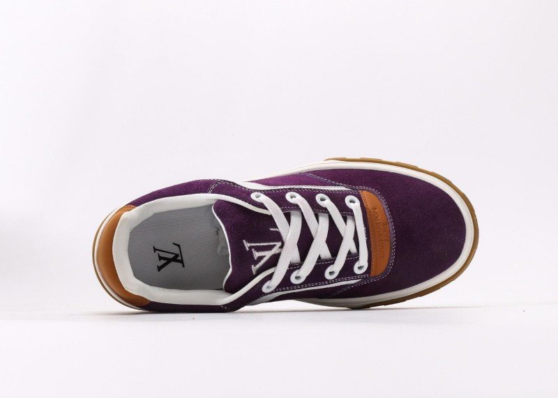 Louis Vuitton LV sneakers feature a green suede upper with brown leather accents, white stripe detailing, and 3D-printed signature Logo for luxury appeal. The 5cm platform design subtly elongates leg lines, with exclusive mold outsole and internal-external locking technology resisting deformation after 8000 bends, making it a celebrity-favorite in fashion circles.