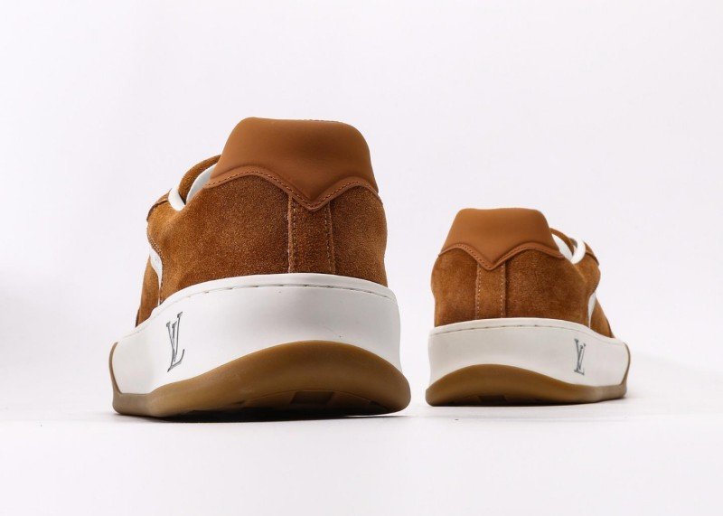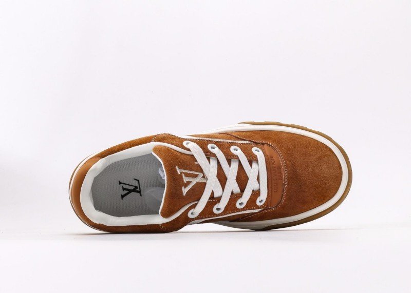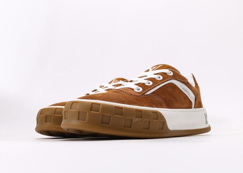 Louis Vuitton LV sneakers feature a green suede upper with brown leather accents, white stripe detailing, and 3D-printed signature Logo for luxury appeal. The 5cm platform design subtly elongates leg lines, with exclusive mold outsole and internal-external locking technology resisting deformation after 8000 bends, making it a celebrity-favorite in fashion circles.