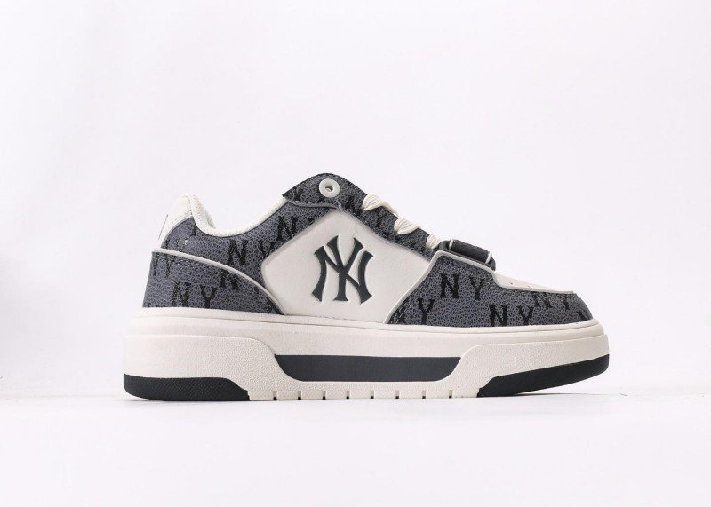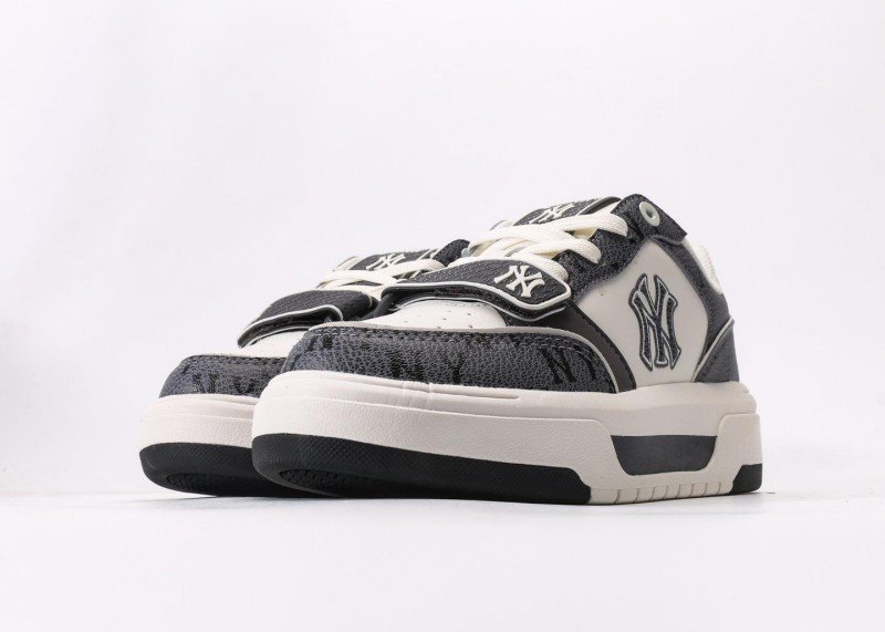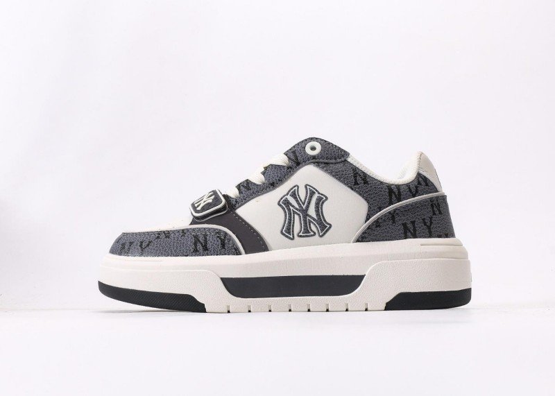 Gray monogram printed upper with premium texture, 3D white NY logo, Velcro design for easy on/off, leather panels enhance durability, minimalist yet fashionable.