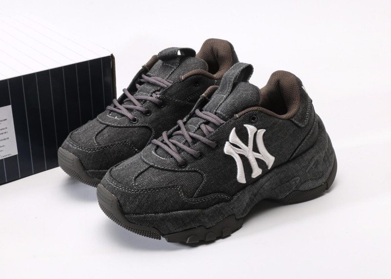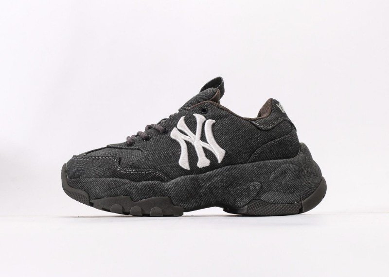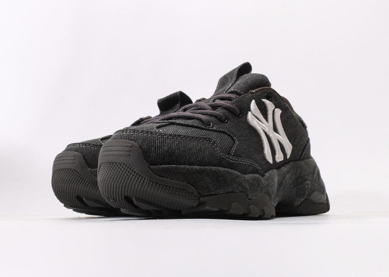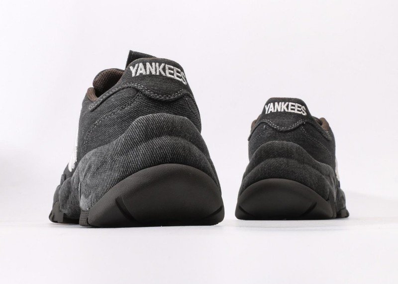 MLB New York Yankees Senior Series low-top dad shoes crafted with black denim material, featuring white NY logo, minimalist retro style essential for all-season versatility.
