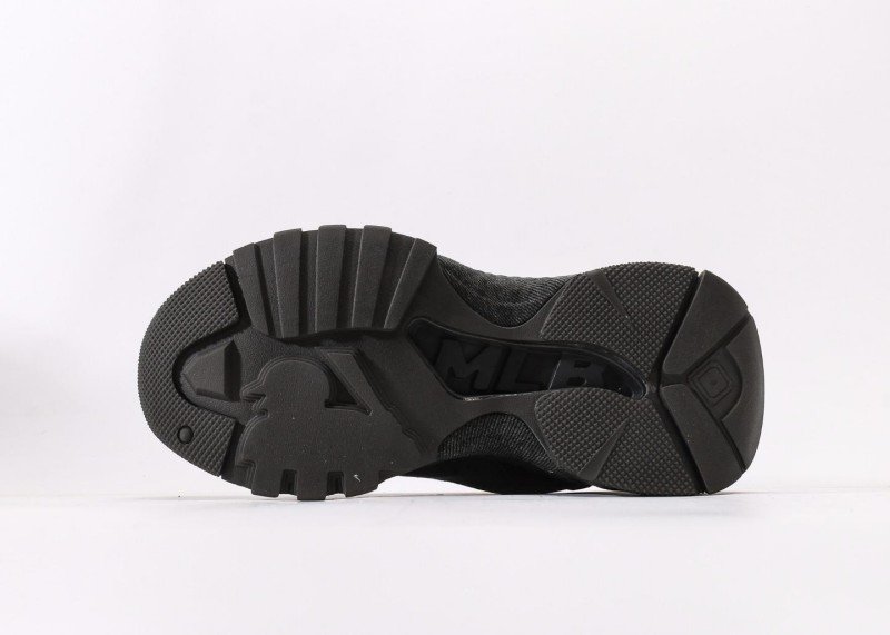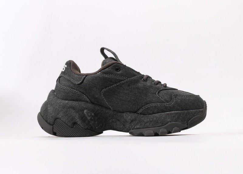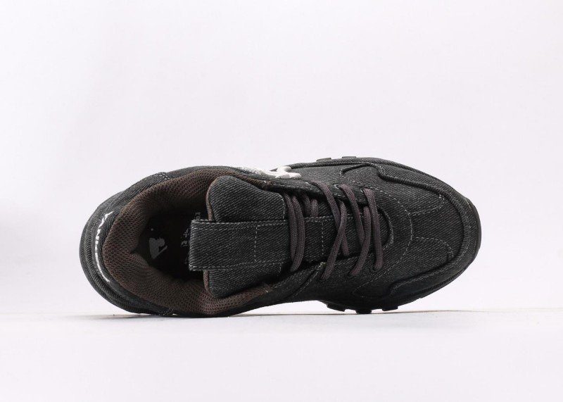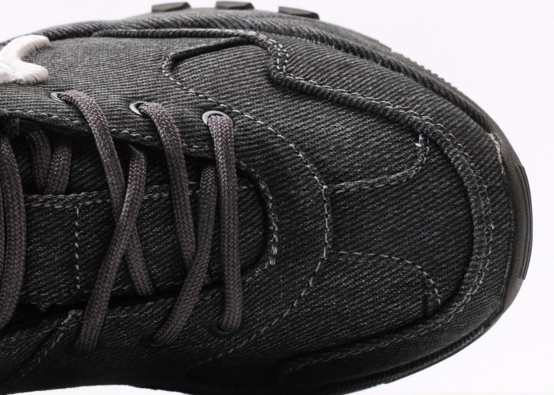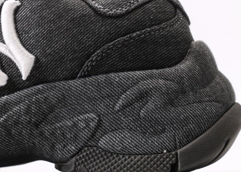 Breathable black denim upper, exquisite embroidered white NY logo, elevated sole design without bulkiness, overall minimalist yet stylish with strong brand identity.