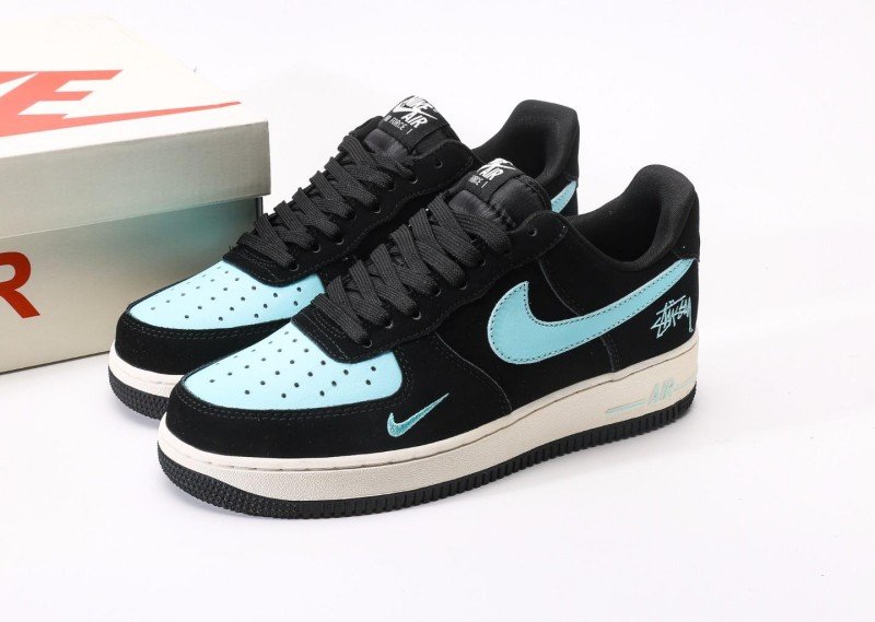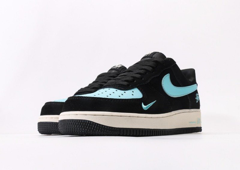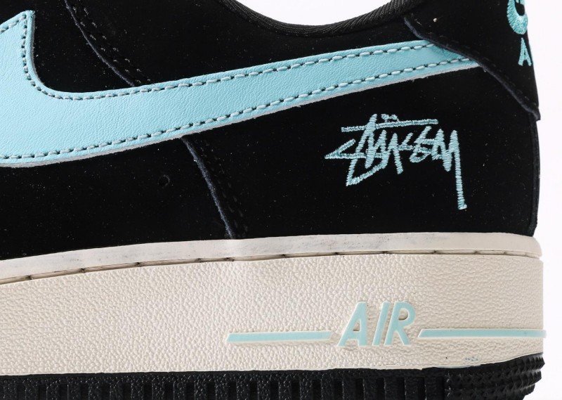 Nike Air Force 1 Low x Stash Collaboration Sneaker combines street art with black suede, light blue Swoosh, Stash signature, and cream-black outsole for exclusive graffiti design.