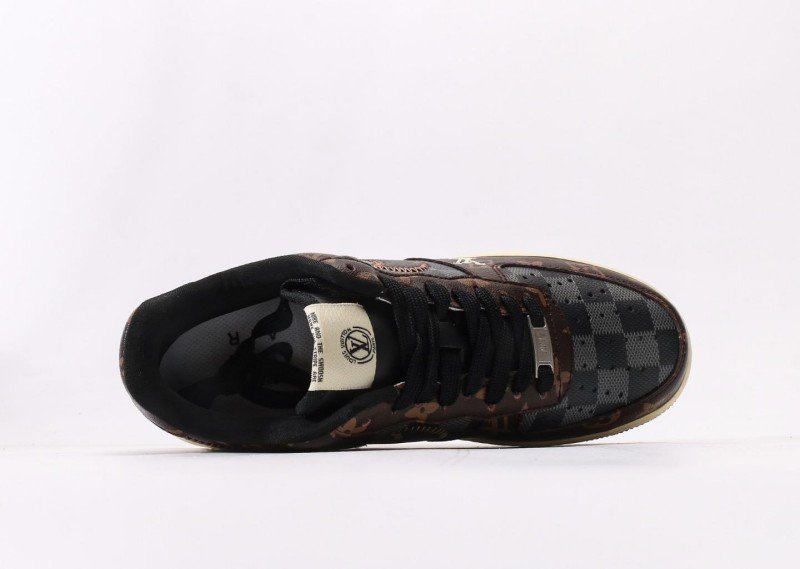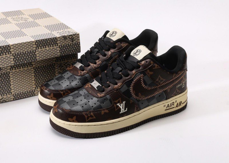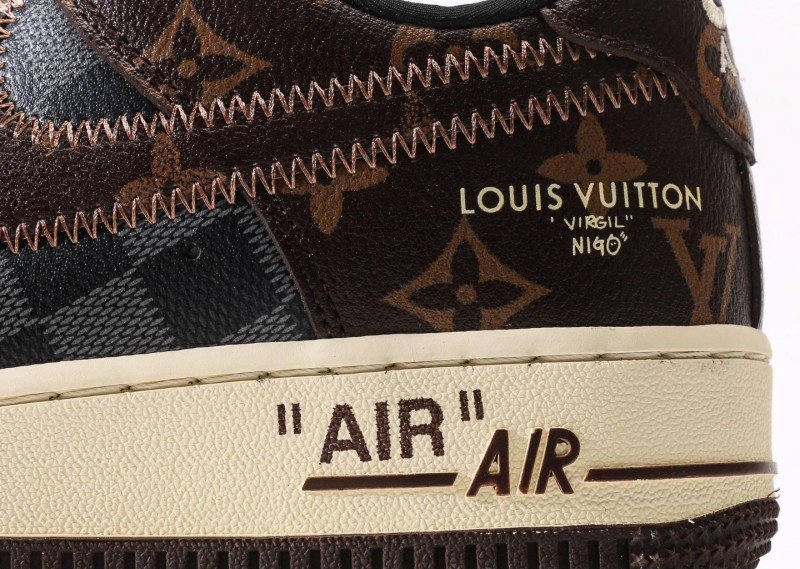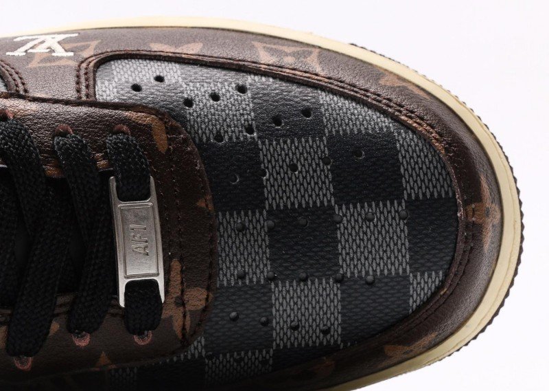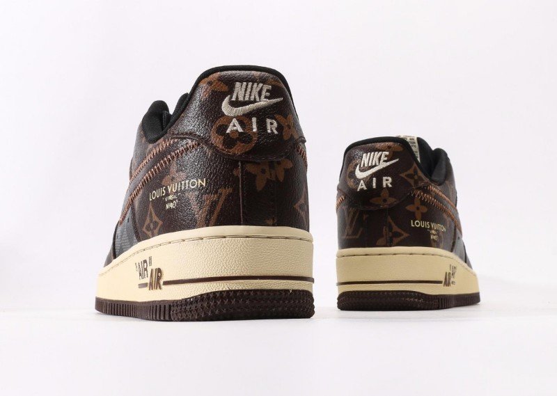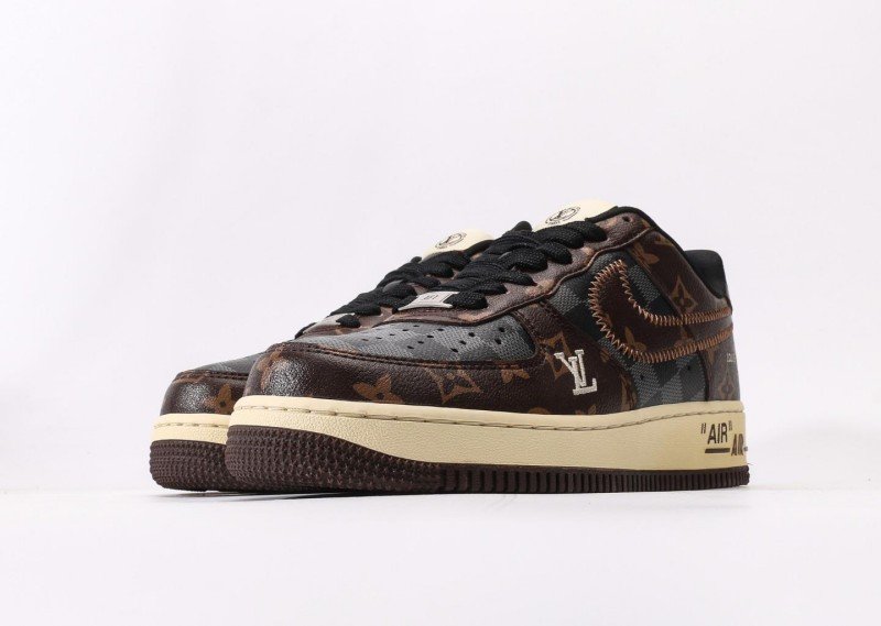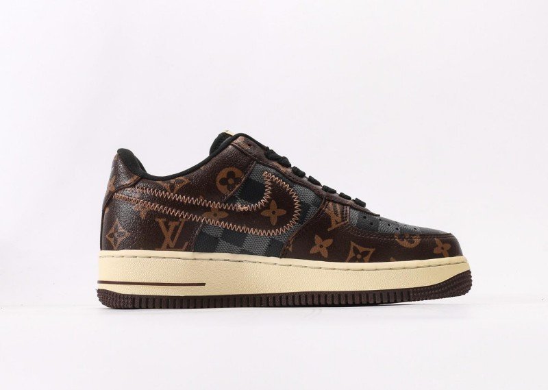 Nike Air Force 1 Low x Louis Vuitton Brown Monogram Sneaker combines luxury with brown monogram canvas, cream panel, monogram Swoosh, and cream outsole for exclusive LV collaboration identity.