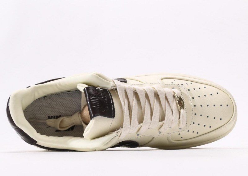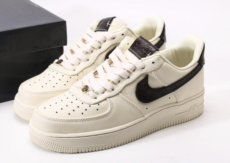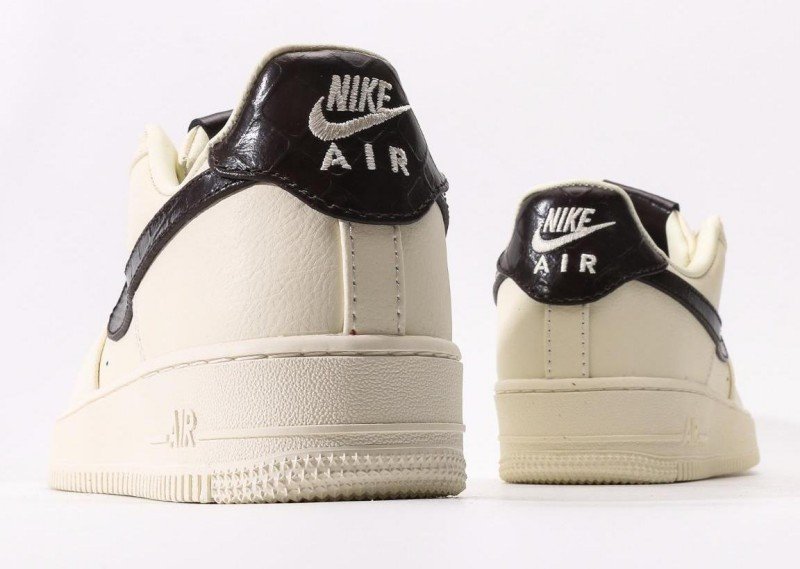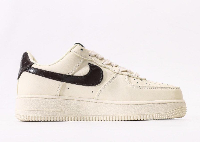Nike Air Force 1 Low Cream Black Sneaker combines minimalist elegance with cream leather, black crocodile-patterned Swoosh, and cream outsole for sophisticated modern design.