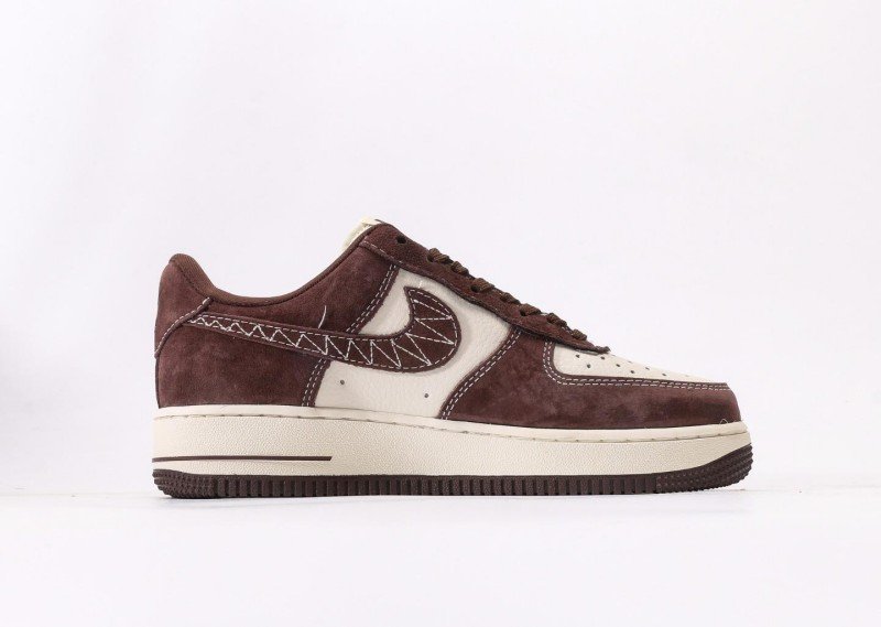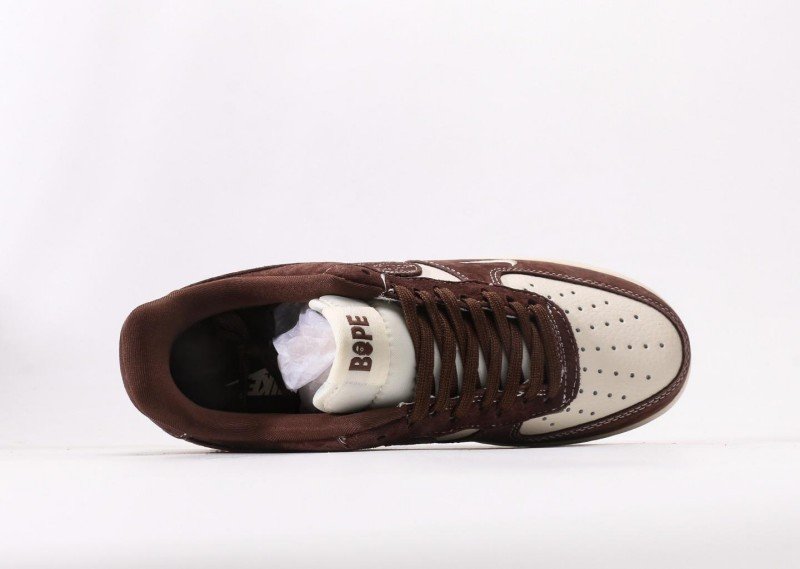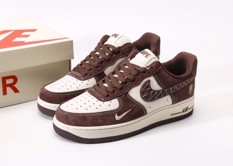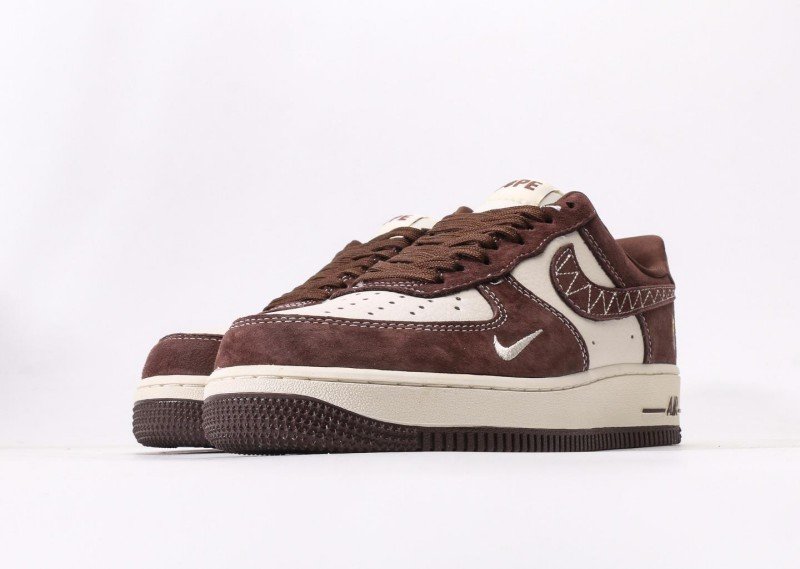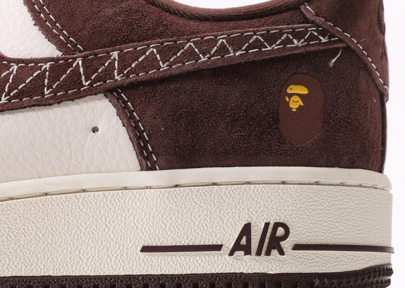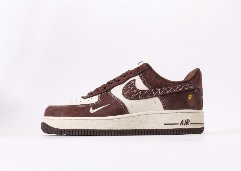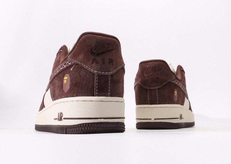 Nike Air Force 1 Low x BAPE Dark Brown Cream Sneaker combines street style with dark brown suede, cream panel, Ape Head motif, and dark brown Swoosh for exclusive collaboration identity.
