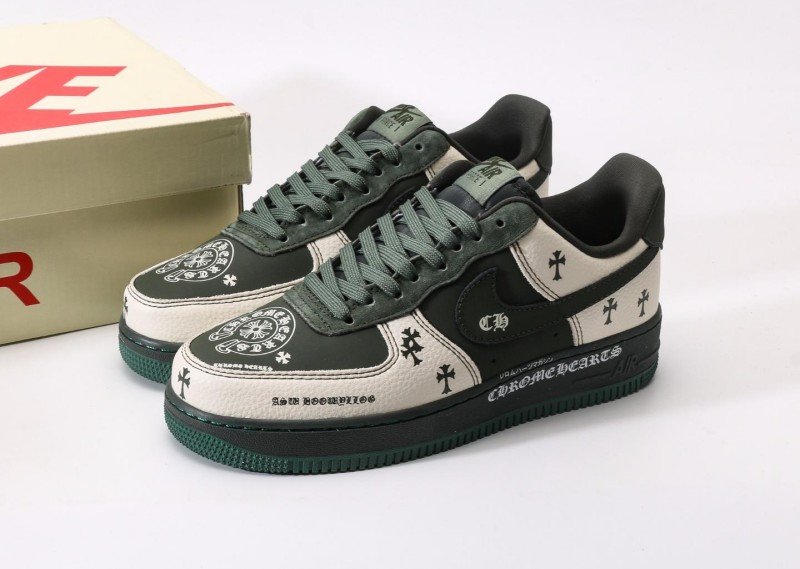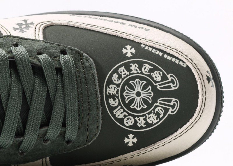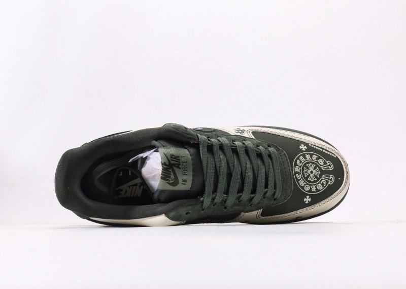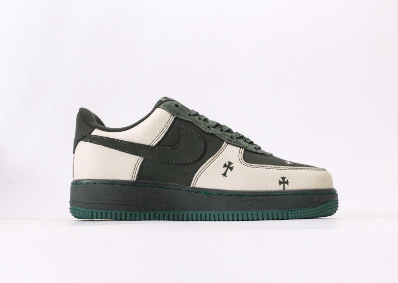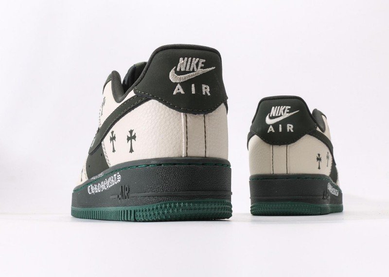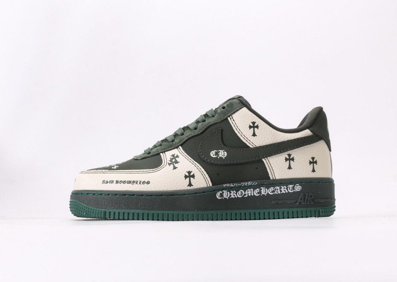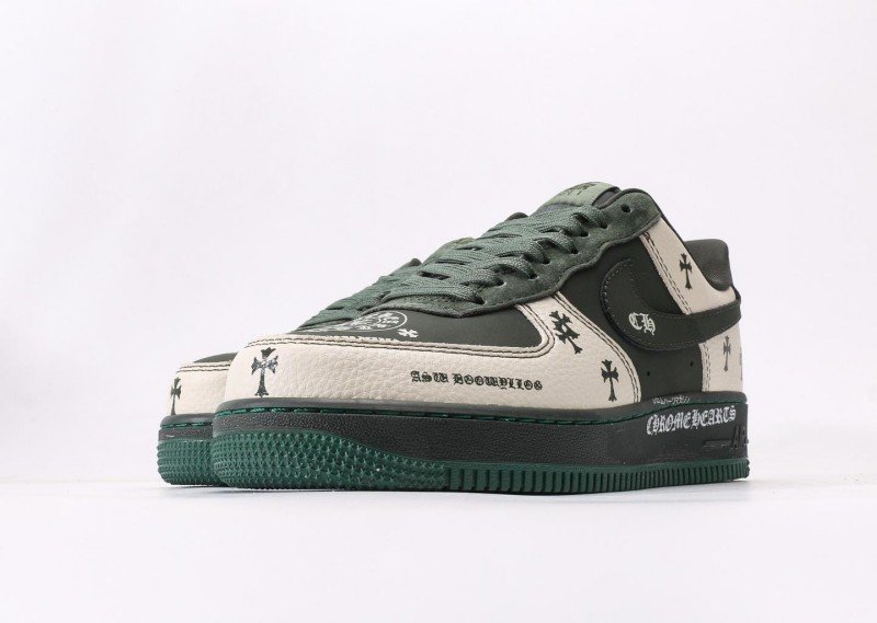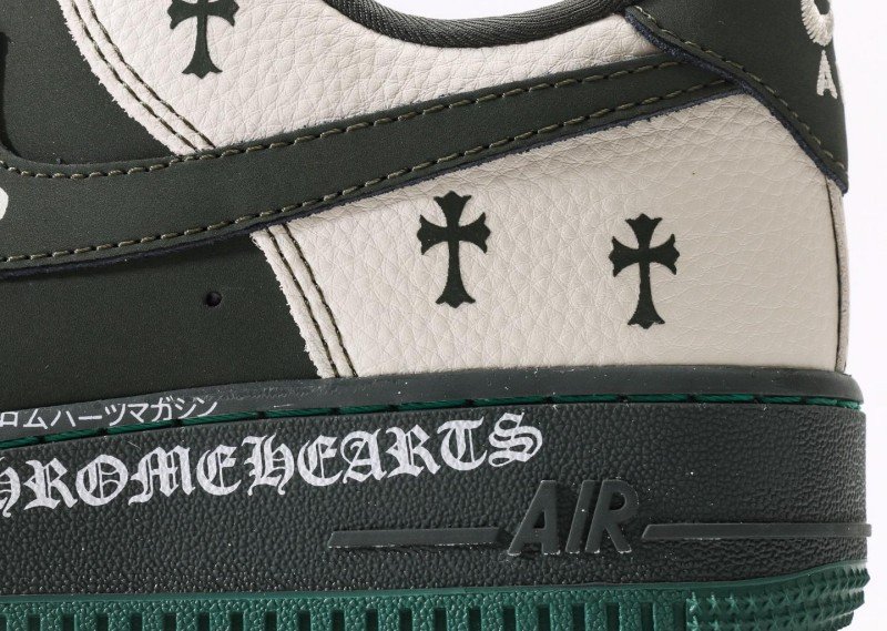 Nike Air Force 1 Low x Chrome Hearts Dark Green Cream Sneaker combines religious and street style with dark green leather, cream panel, black Swoosh, cross motifs, and dark green outsole for exclusive collaboration identity.