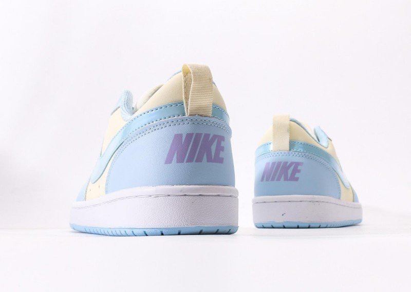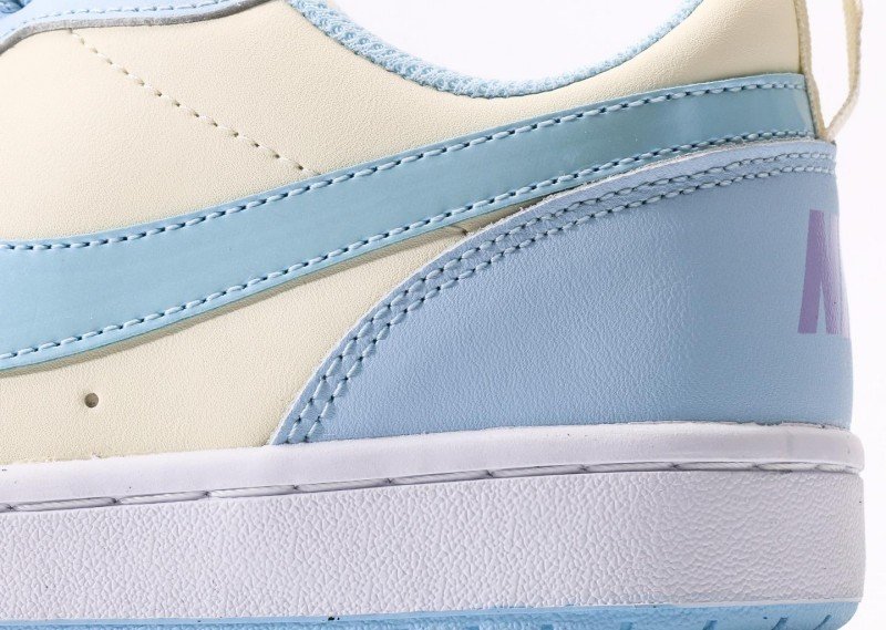 Light blue Swoosh contrasts vividly with cream panel, light blue outsole enhances fresh aesthetic, stitching details highlight craftsmanship.