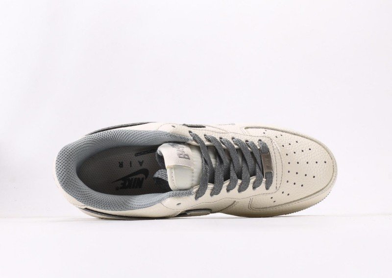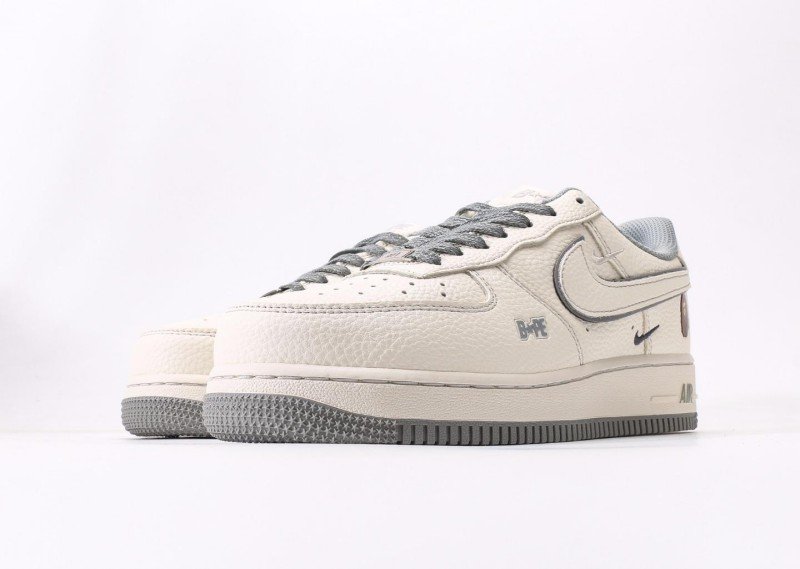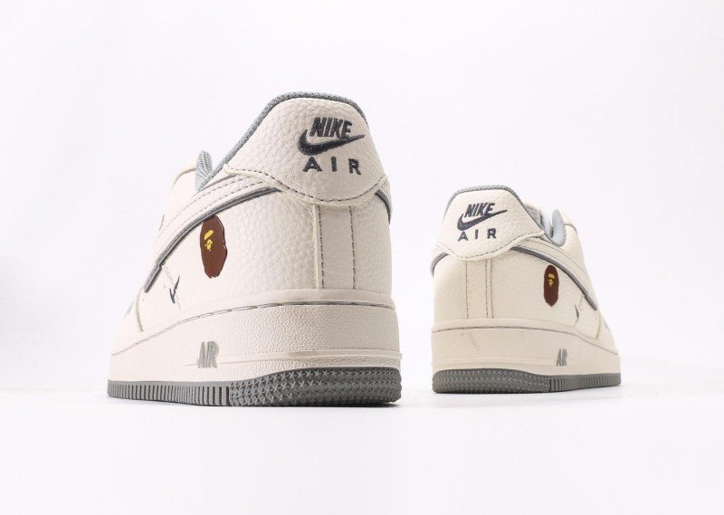 Nike Air Force 1 Low x BAPE Cream Gray Sneaker combines street style with cream-gray colorway, featuring BAPE ape head motif, gray Swoosh, and “BAPE” lettering for exclusive collaboration identity.