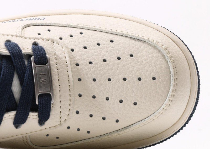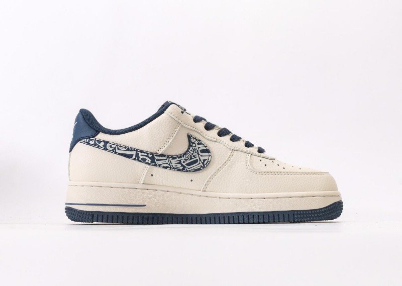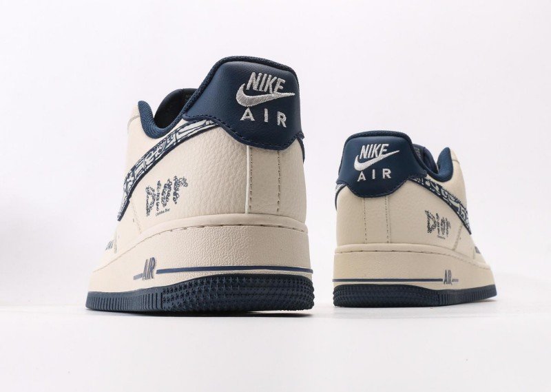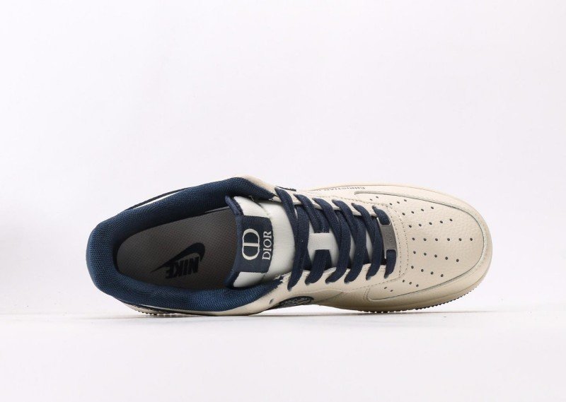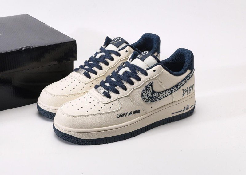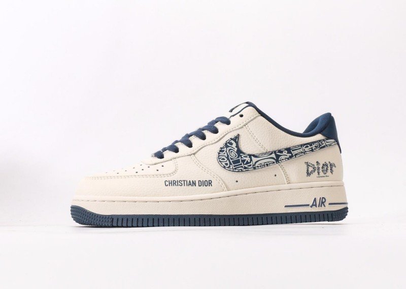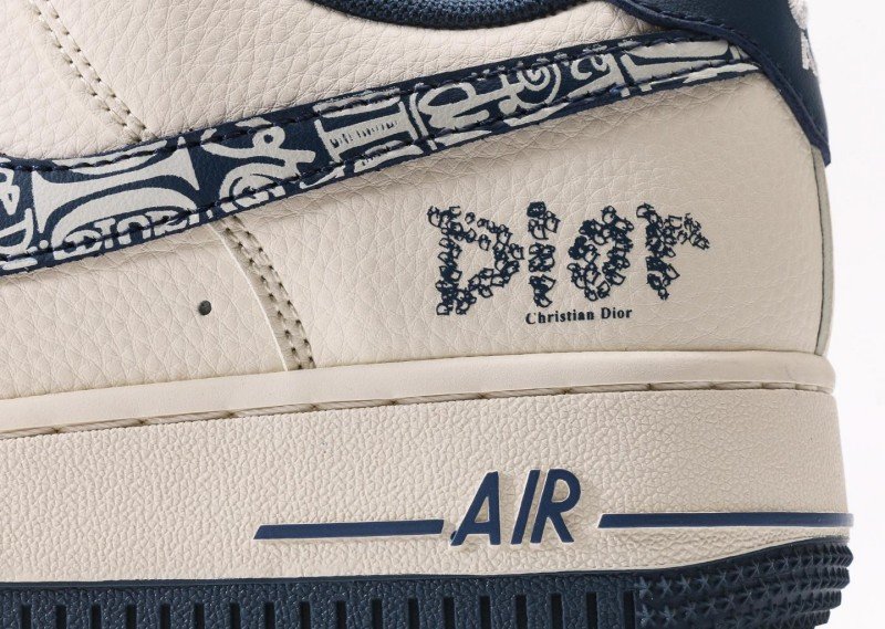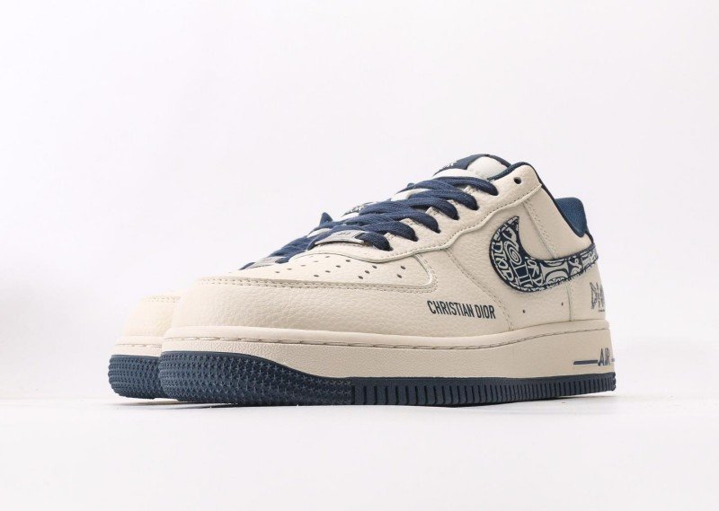 Nike Air Force 1 Low x Dior Cream Blue Sneaker reinvents luxury fashion with cream-blue colorway, featuring navy Dior pattern and brand lettering for exclusive collaboration identity.
