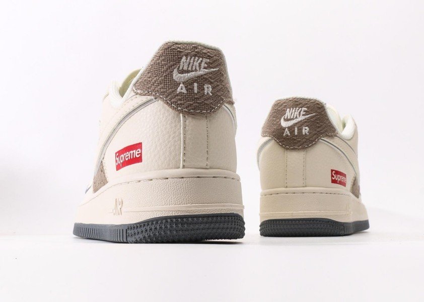 Cream Swoosh logo harmonizes with brown fabric, red Supreme logo echoes gray outsole, minimalist design highlights collaboration uniqueness and street style.
