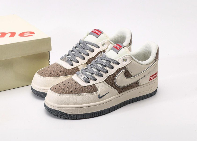 Nike Air Force 1 Low x Supreme Cream Brown Sneaker reinvents street fashion with minimalist colorway, featuring brown fabric panel and red Supreme logo for unique collaboration identity.