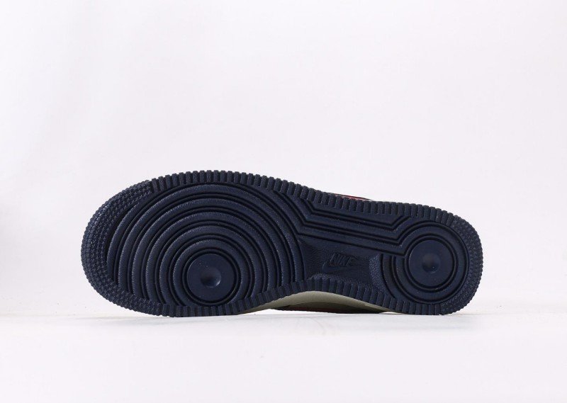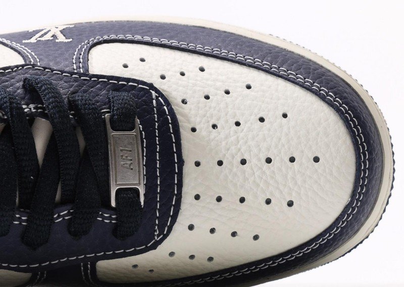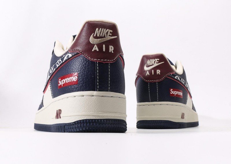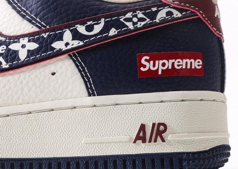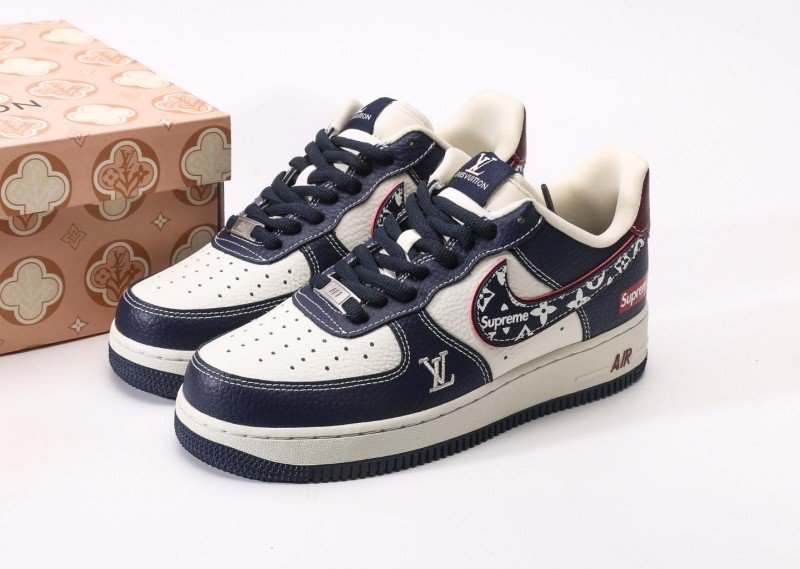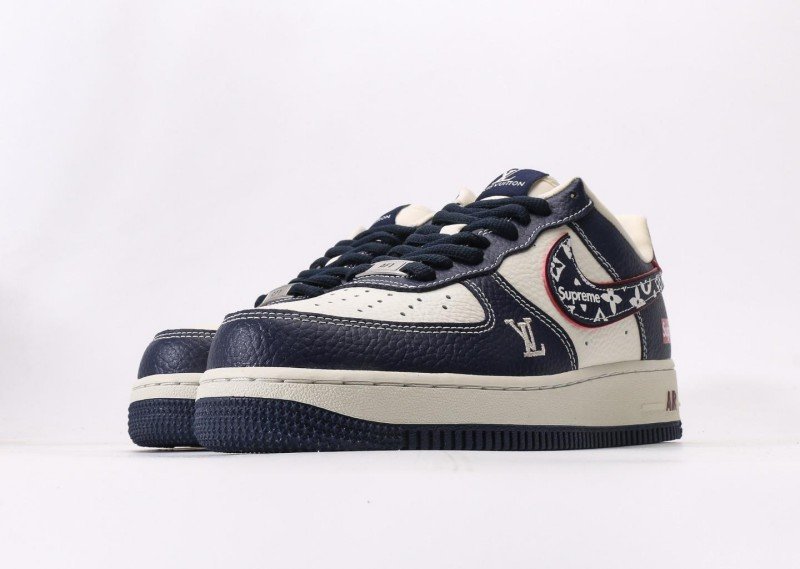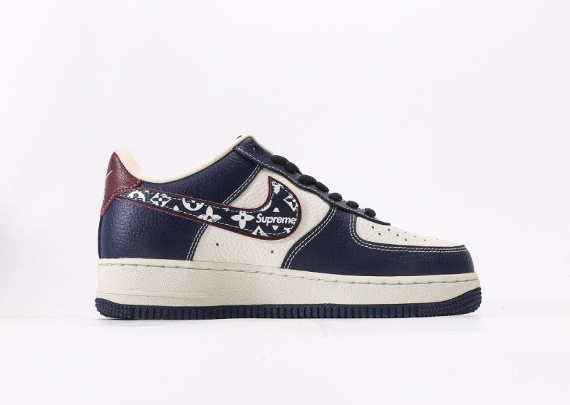 Nike Air Force 1 Low x Supreme x Louis Vuitton Navy Monogram Sneaker reinvents luxury with navy leather, monogram Swoosh, red “Supreme” tag, and “LV” lettering for exclusive 3-way collaboration identity.