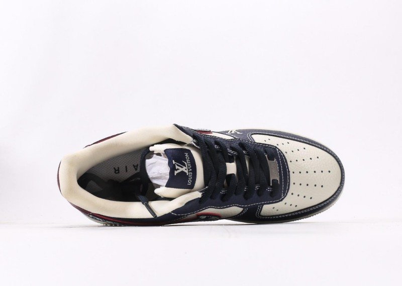 Monogram Swoosh contrasts elegantly with navy leather, red tag and “LV” lettering enhance luxury appeal, navy outsole completes sophisticated design.