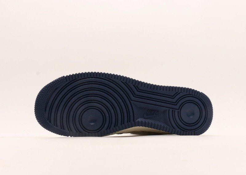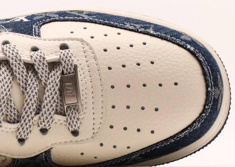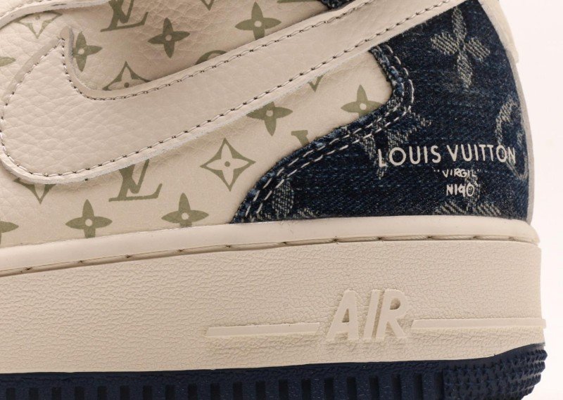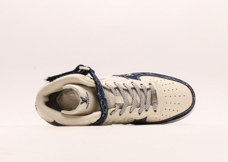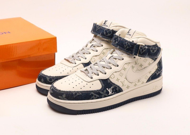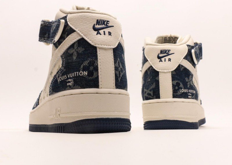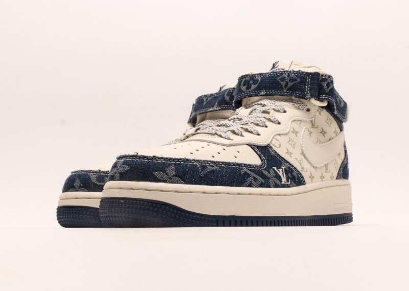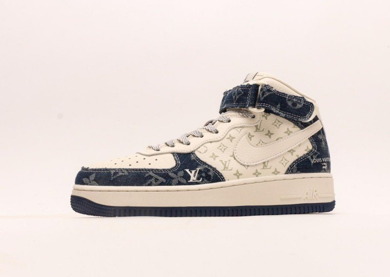 Nike AIR FORCE 1 MID 07 x Louis Vuitton Collaboration Sneaker combines luxury with cream leather, navy monogram canvas, Velcro strap, and cream-navy outsole for exclusive LV co-branded identity.