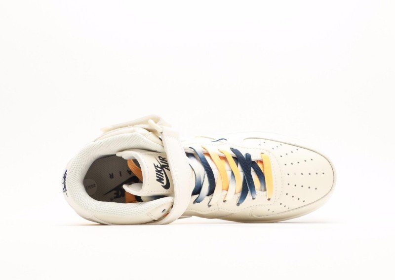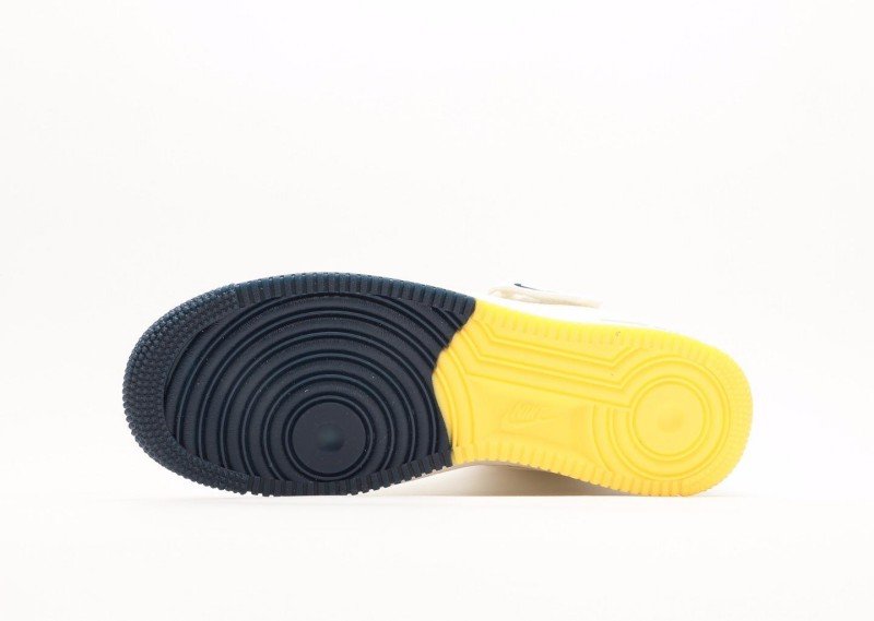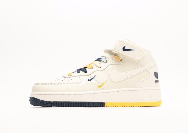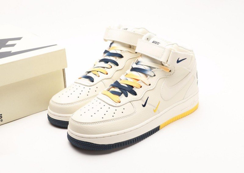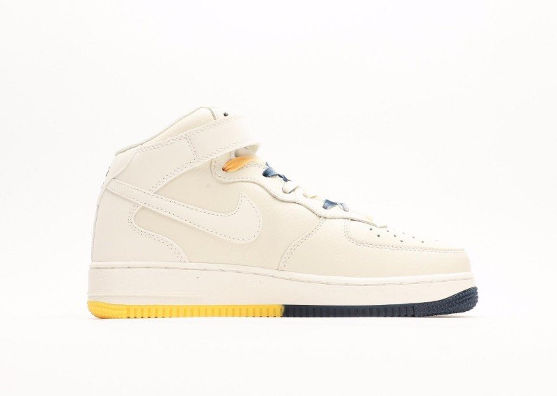 Nike AIR FORCE 1 MID 07 x Union Collaboration Sneaker combines street style with classic design through cream leather, yellow-blue Swooshes, Velcro strap, and cream-yellow-blue outsole for iconic multi-Swoosh streetwear.