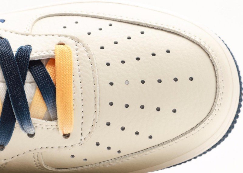 Cream leather upper with yellow-blue Swooshes, Union logo, Velcro strap, cream-yellow-blue rubber outsole with superior grip and durability for street and daily occasions.