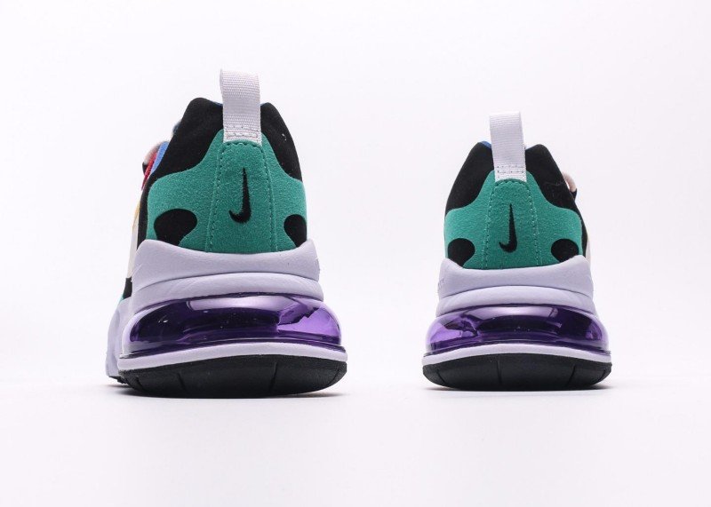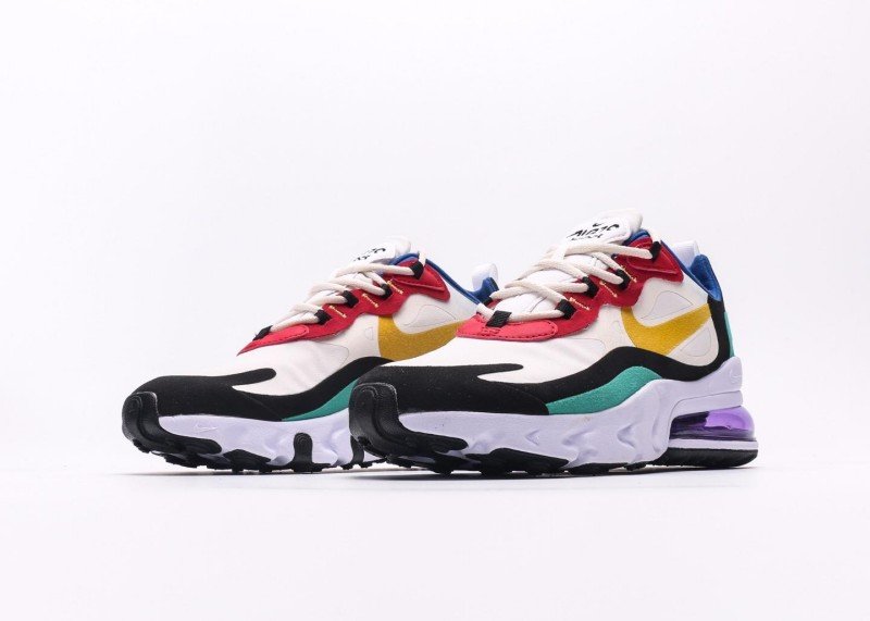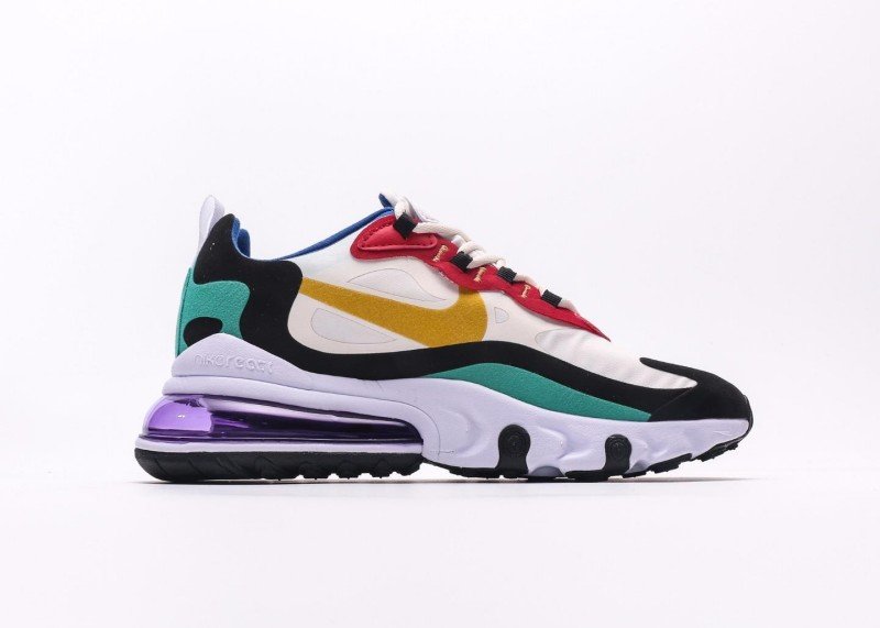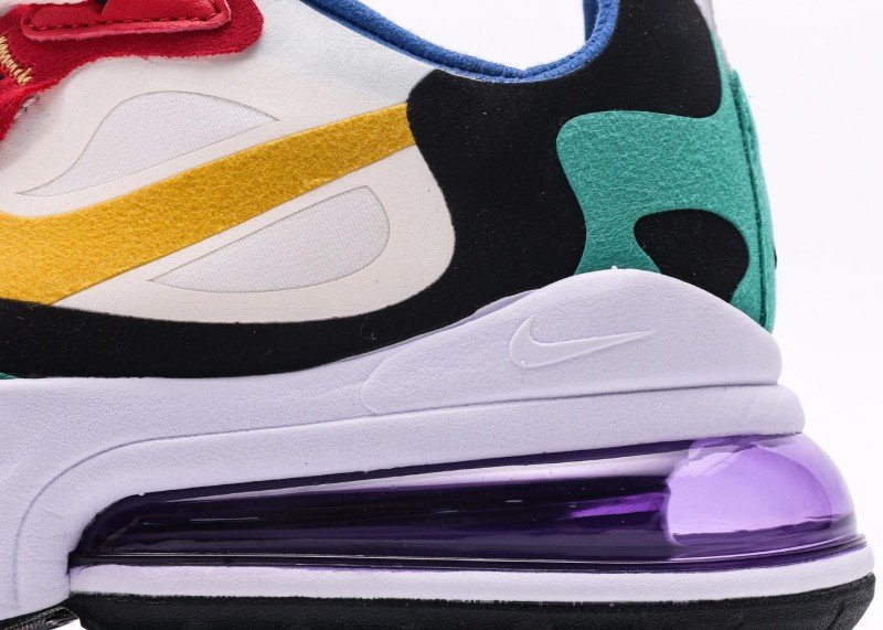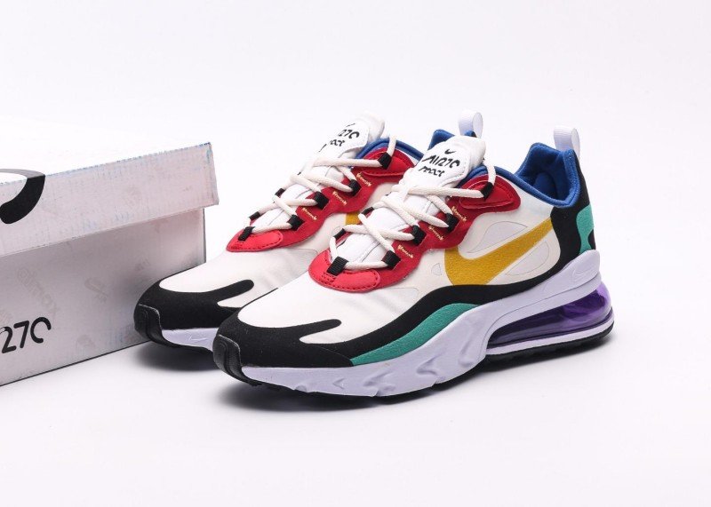 Nike Air Max 270 React features multicolor patchwork design, white mesh upper with yellow Swoosh logo, transparent purple Air Max cushion, blending street trend and technology.