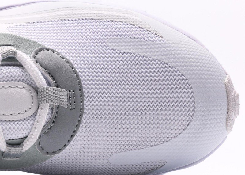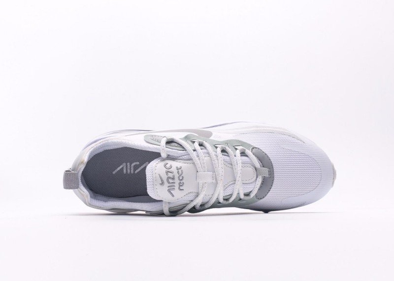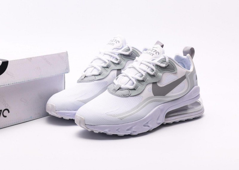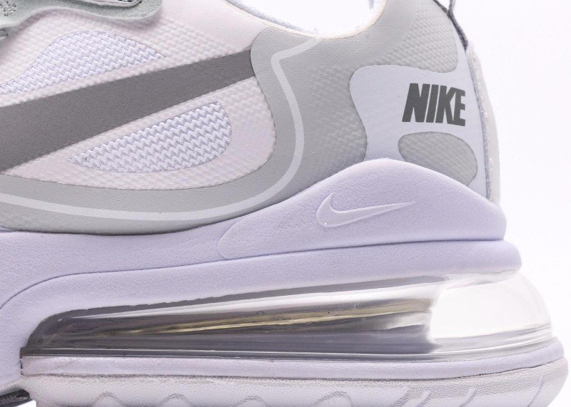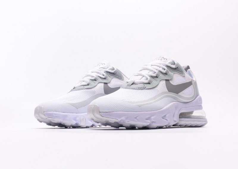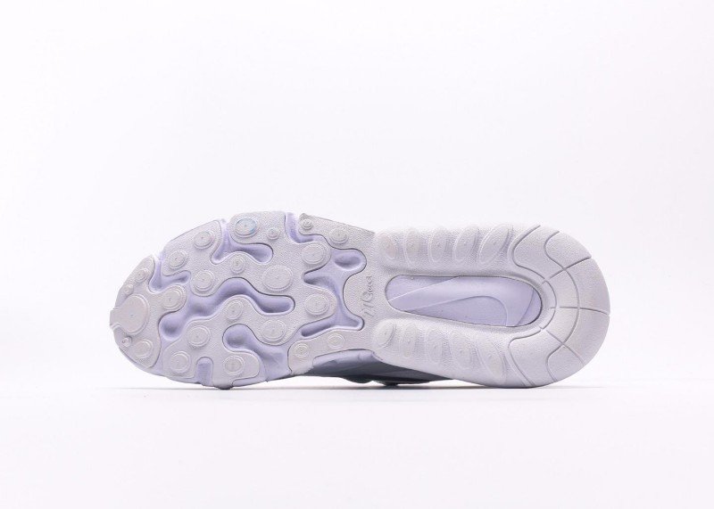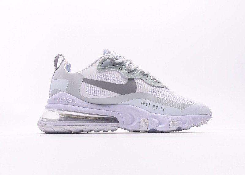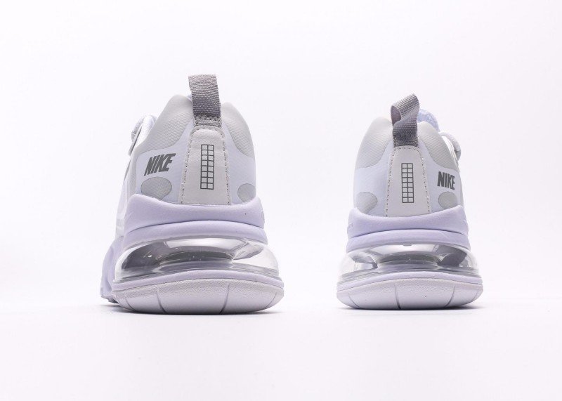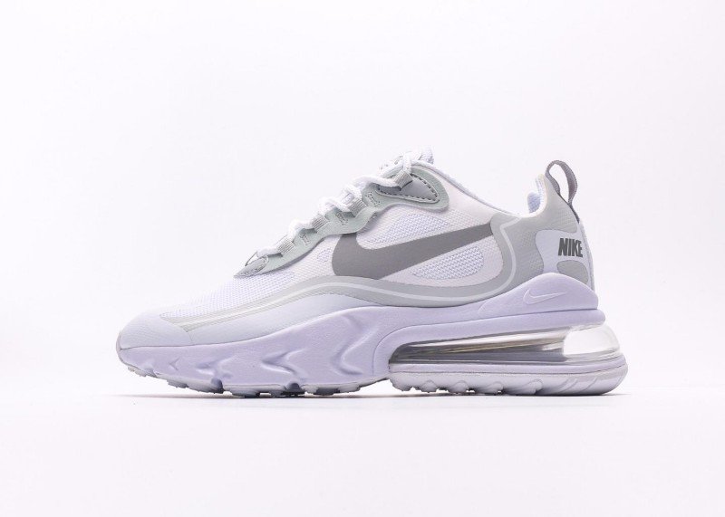 Nike Air Max 270 React features white-light grey colorway, minimalist mesh upper with lavender React midsole, transparent Air Max cushion, blending simplicity and technology.