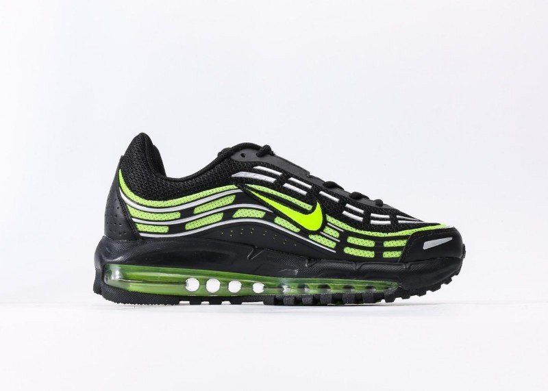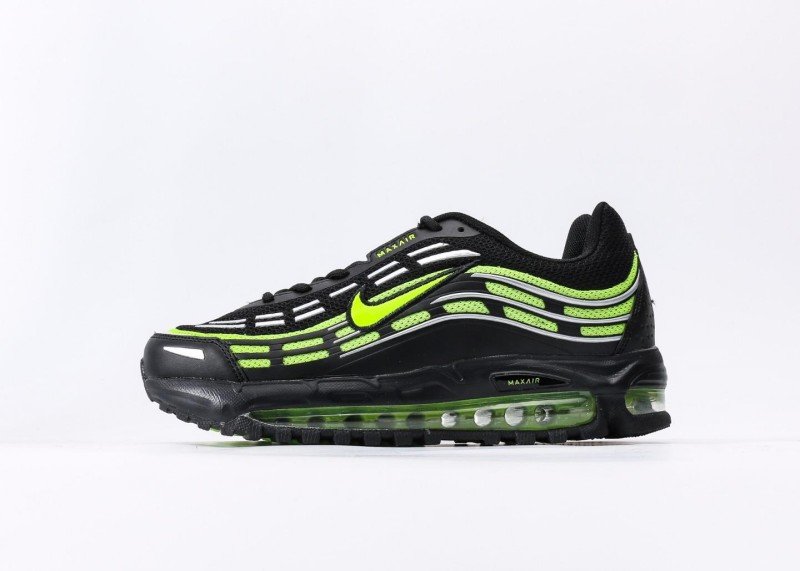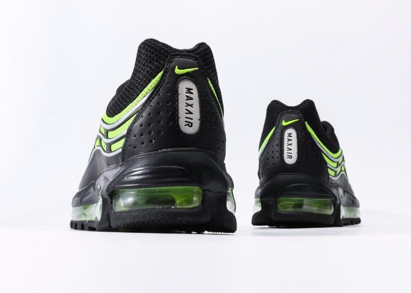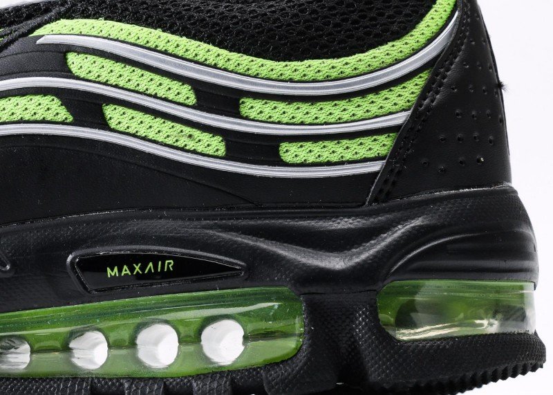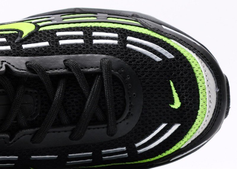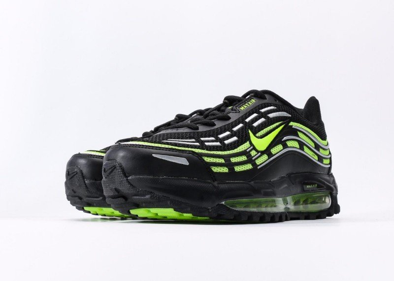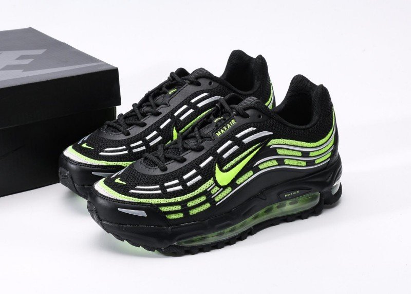Nike Air Max 97 features black-green fluorescent wave design, black mesh upper with green Swoosh logo, full-length transparent green Air Max cushion, blending dynamic and technology.
