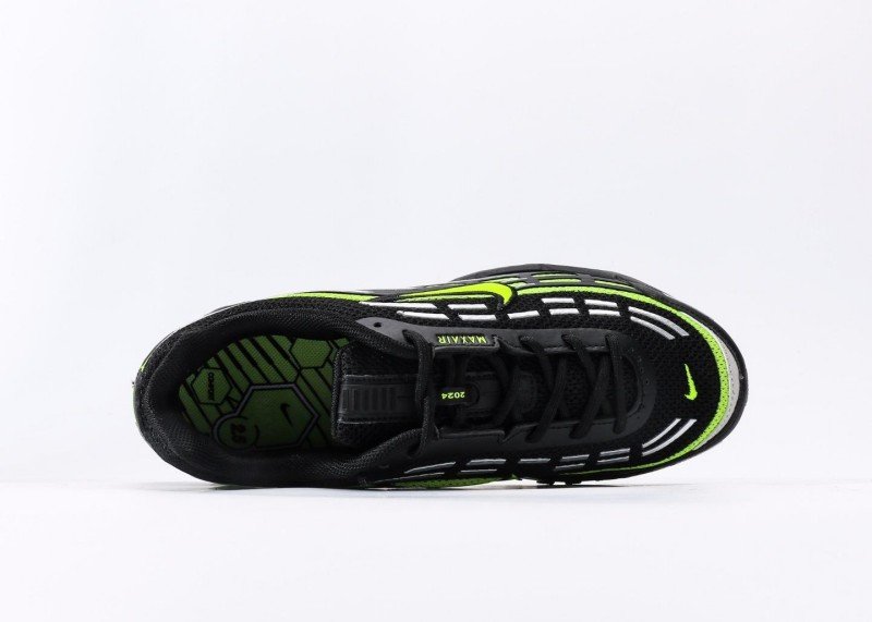 Black-green fluorescent colorway suitable for street fashion and night running, pairing with athletic pants or cargo pants for dynamic look, wave design becomes highlight.
