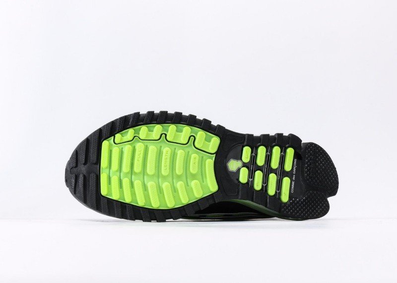 Black mesh enhances breathability, fluorescent green wave stripes add visibility, vibrant green Swoosh, transparent green cushion with strong visual impact, distinct overall layers.