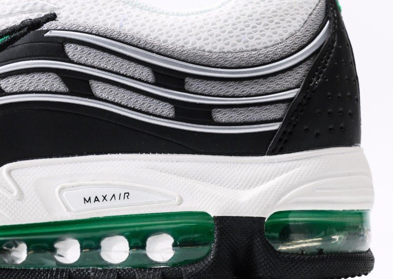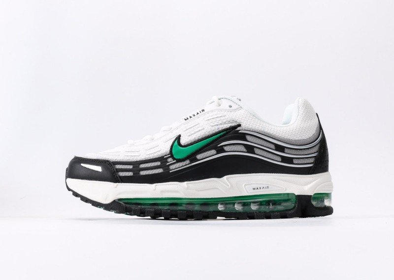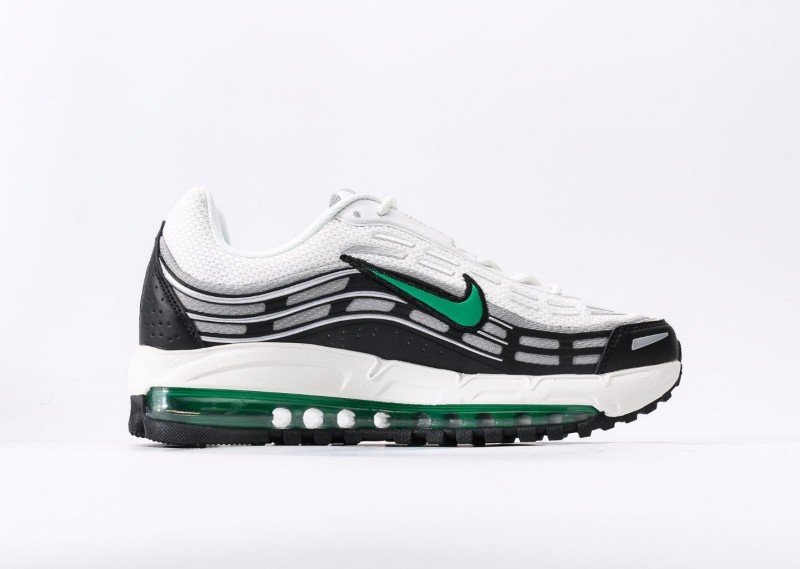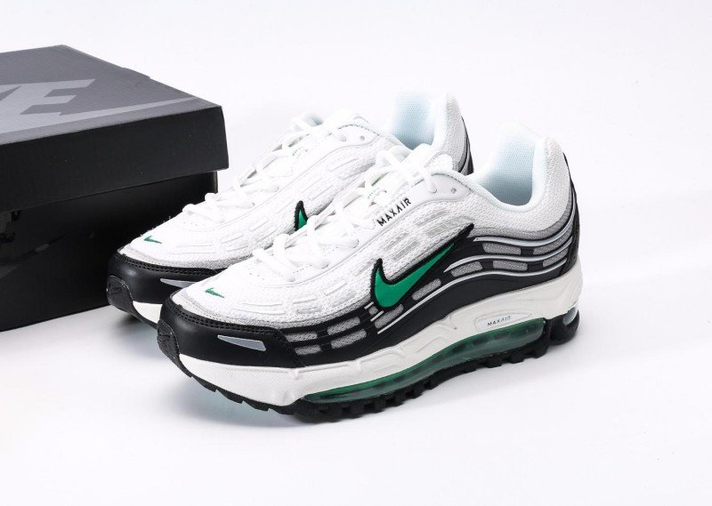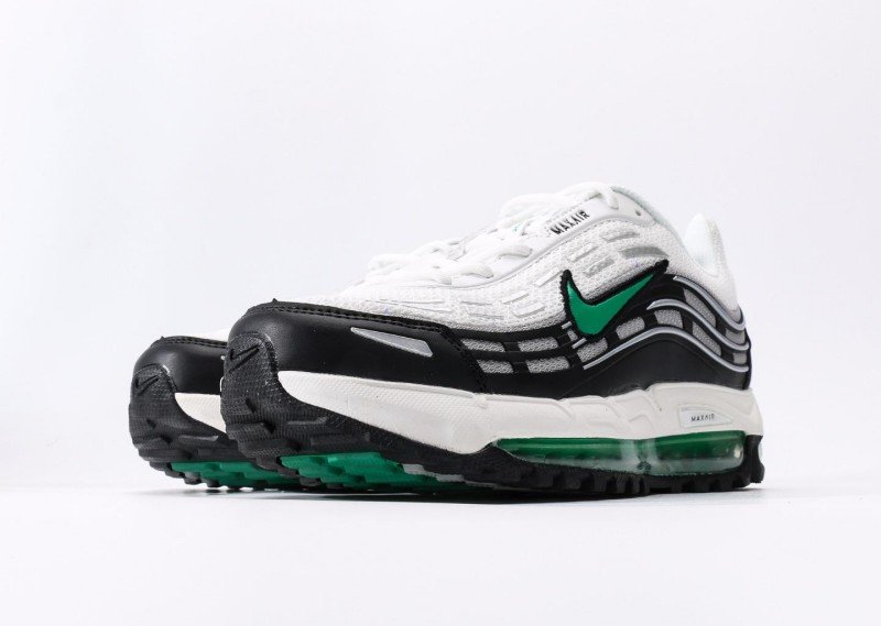 Nike Air Max 97 features white-black-green wave design, white mesh upper with green Swoosh logo, full-length transparent green Air Max cushion, blending sport and technology.