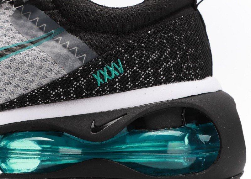Grey-black gradient mesh enhances breathability, eye-catching teal Swoosh, “ZOOM” lettering adds tech appeal, transparent blue-green cushion with strong visual impact, distinct layers.