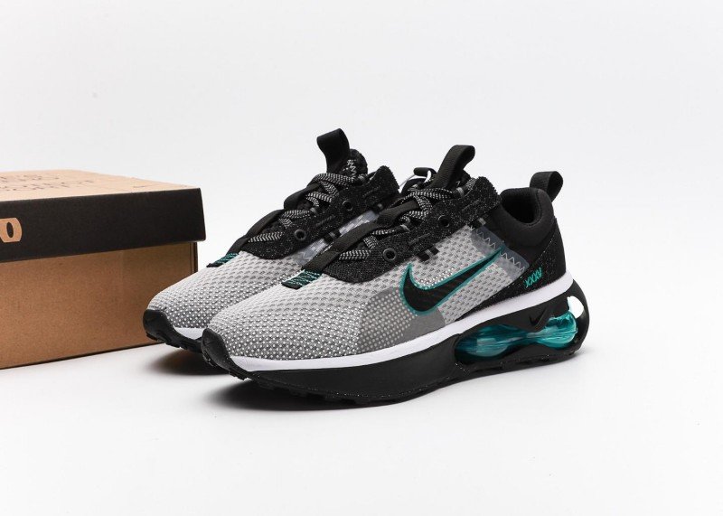 Nike Air Max features grey-black-blue-green gradient design, breathable mesh upper with teal Swoosh logo, transparent blue-green Air Max cushion sole, blending technology and sport.