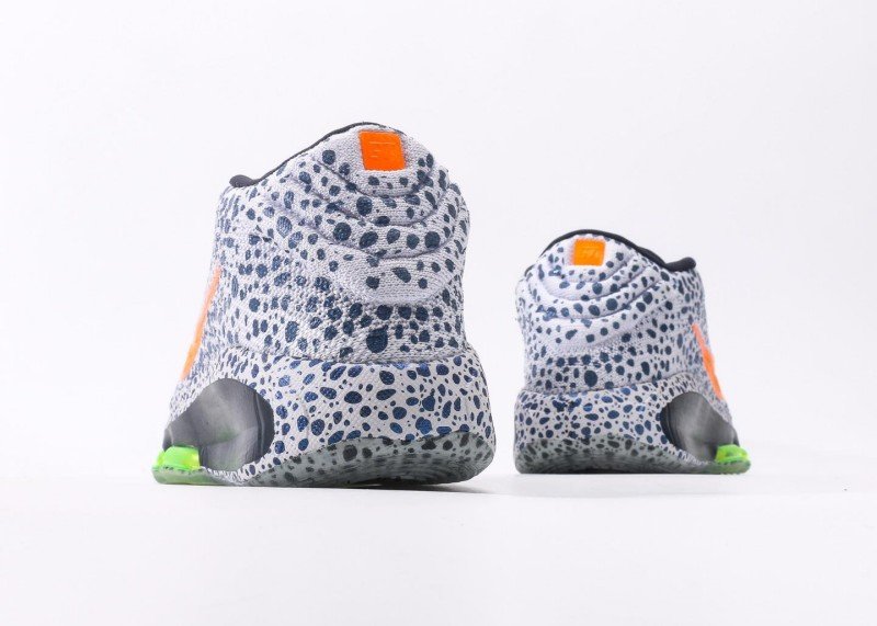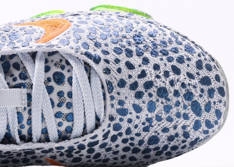 Nike Air Max Leopard Basketball Shoes feature a pure white upper canvas with irregular dark blue leopard spots. Innovative weaving technology wraps feet lightly, blending wildness and elegance.