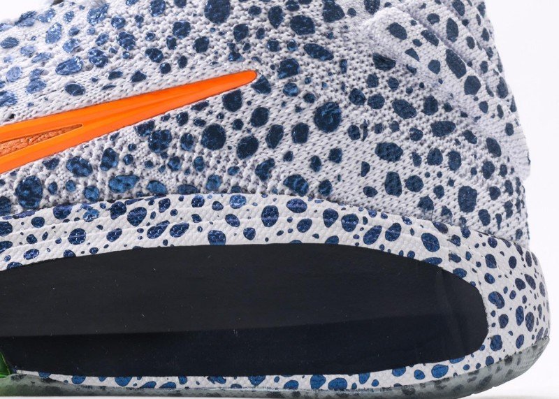 The orange Swoosh logo on the side stands out in 3D relief, creating a color contrast with dark blue leopard patterns. The orange tongue logo echoes the dark blue inner shoe mouth, showcasing craftsmanship in every detail.