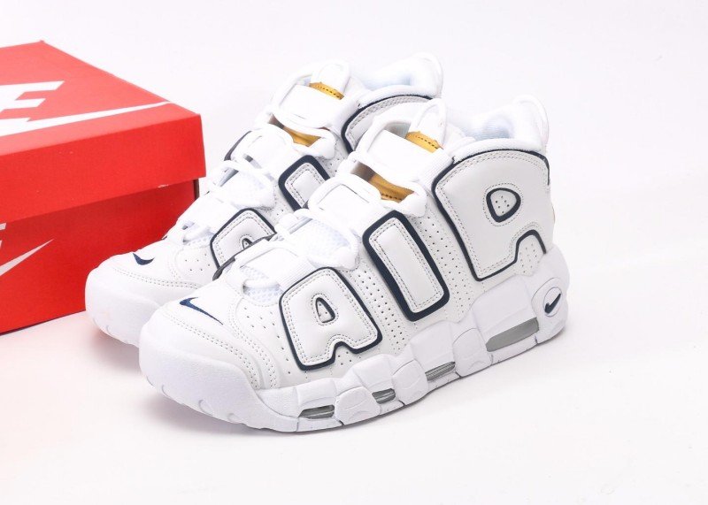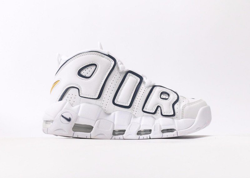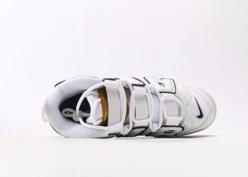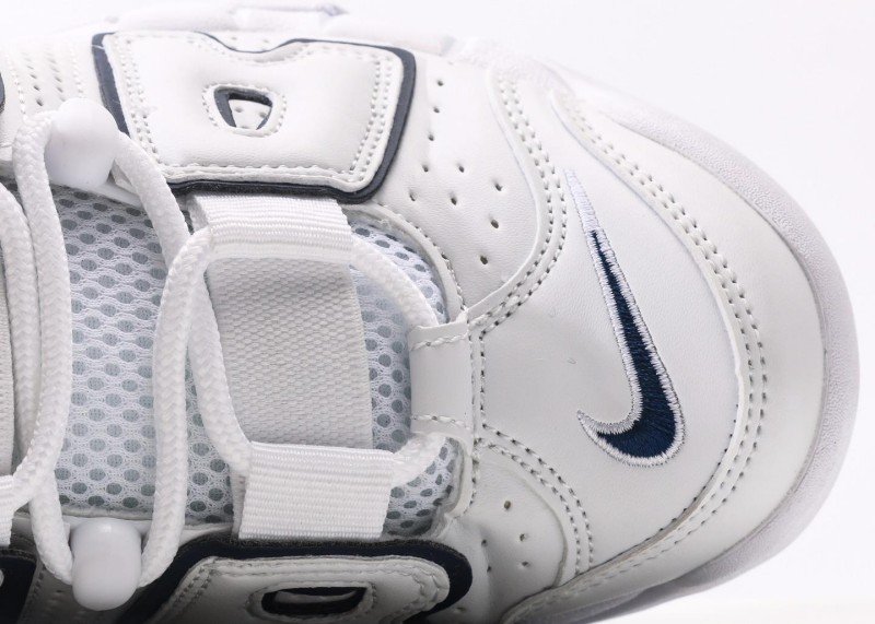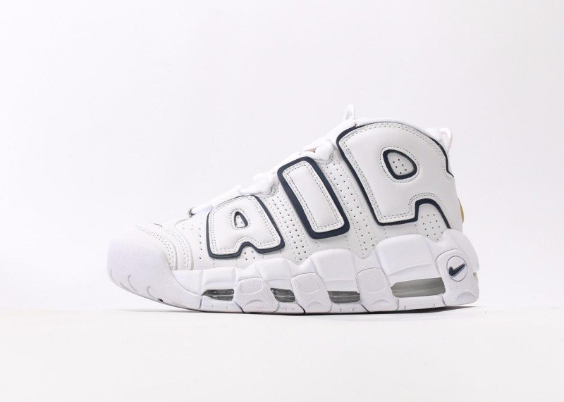 Nike Air More Uptempo features white-blue navy design, white upper with blue piping, high-top Velcro straps, and full-length Air Max cushion for minimalist style.