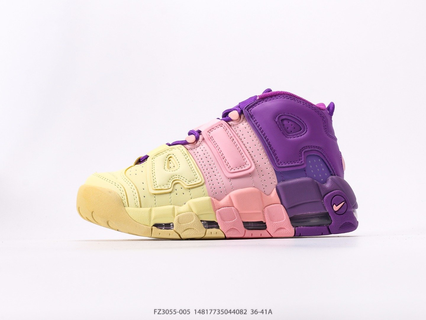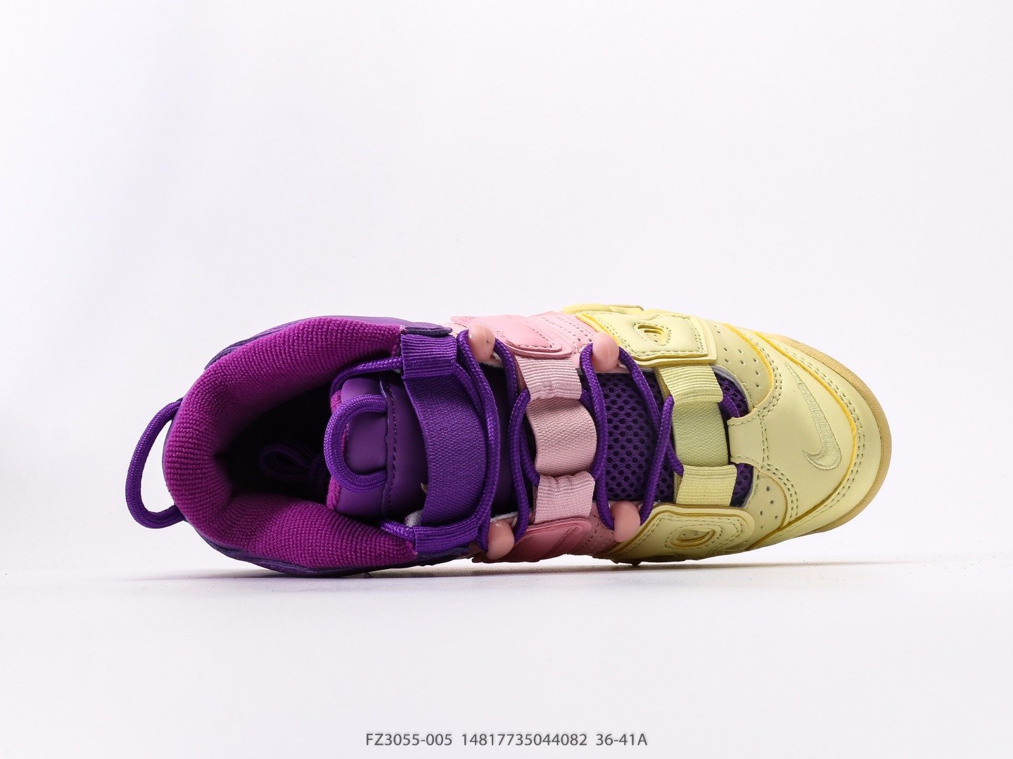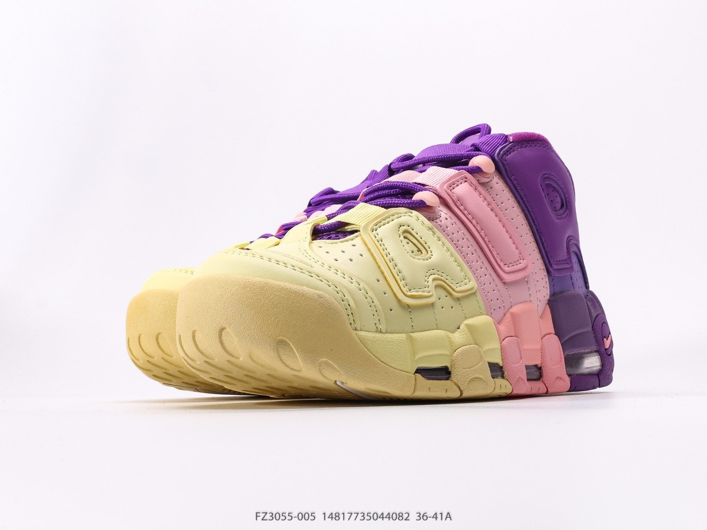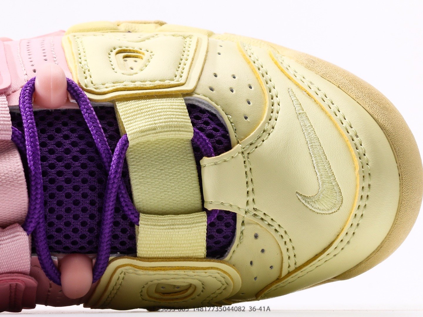 Nike Air More Uptempo Low features yellow-pink-purple patchwork design, high-top silhouette with Velcro straps, full-length transparent Air Max cushion, blending retro and street fashion.