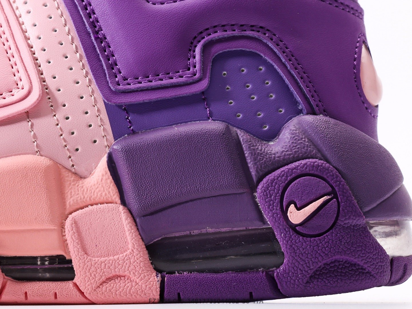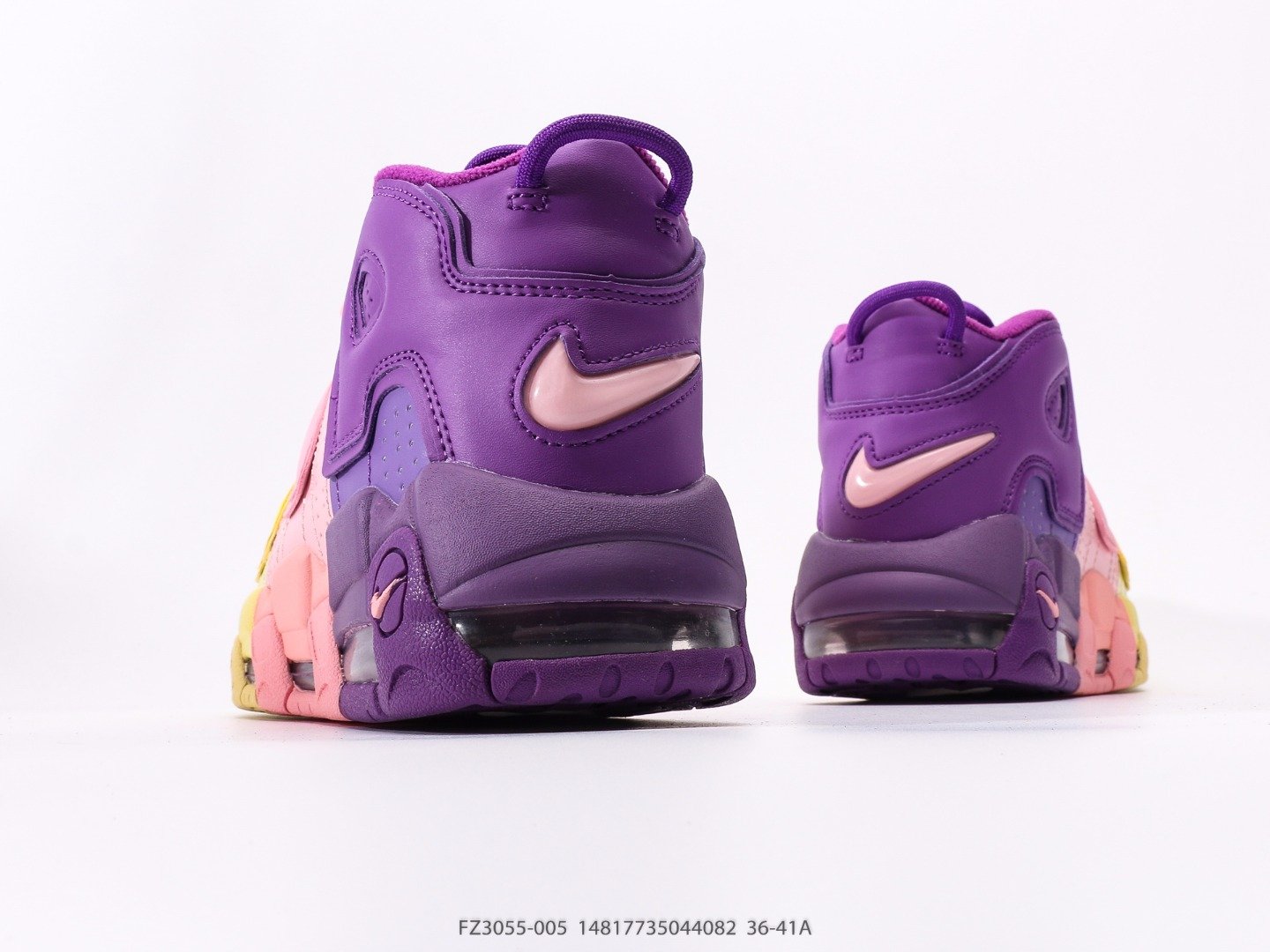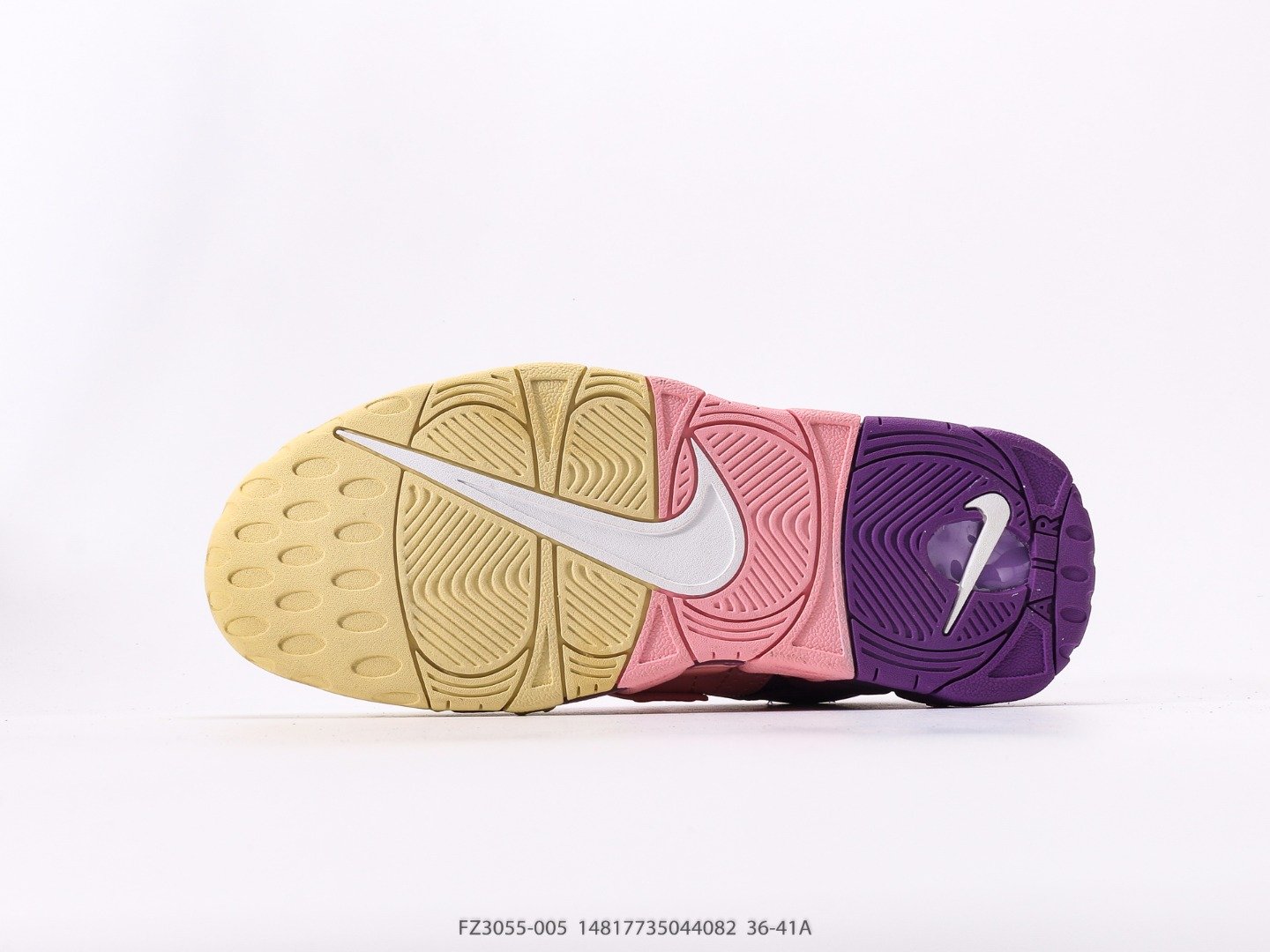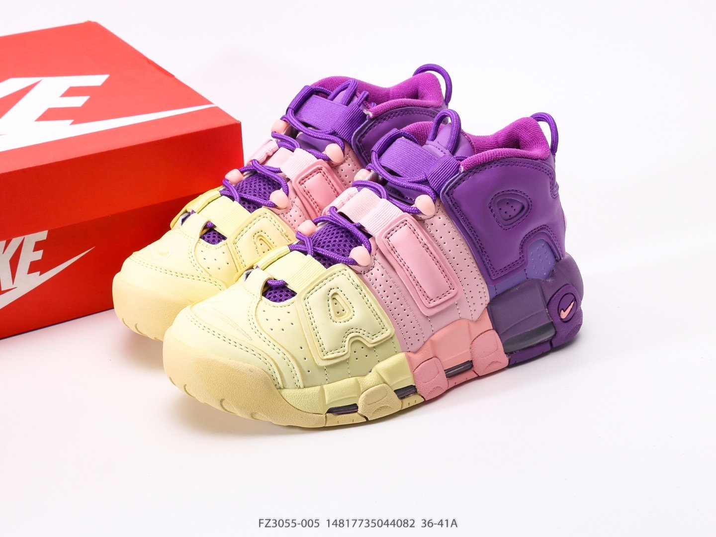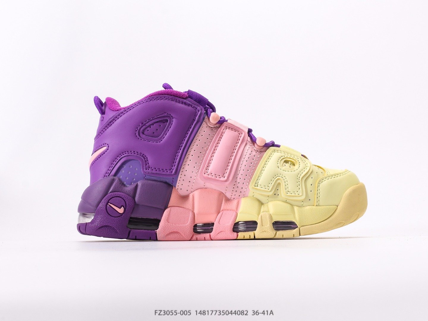 Nike Air More Uptempo Low features yellow-pink-purple patchwork design, high-top silhouette with Velcro straps, full-length transparent Air Max cushion, blending retro and street fashion.