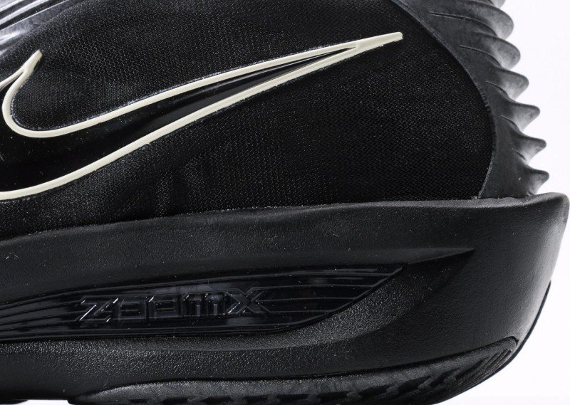 All-black ZOOMX sole with forefoot and heel tread patterns enhancing traction, “ZOOMX” branding on side highlighting technological core, providing excellent cushioning and rebound.