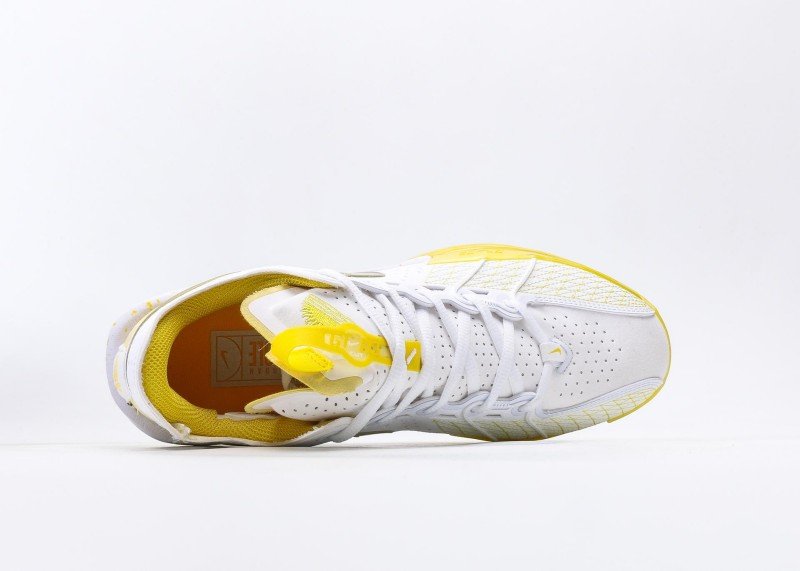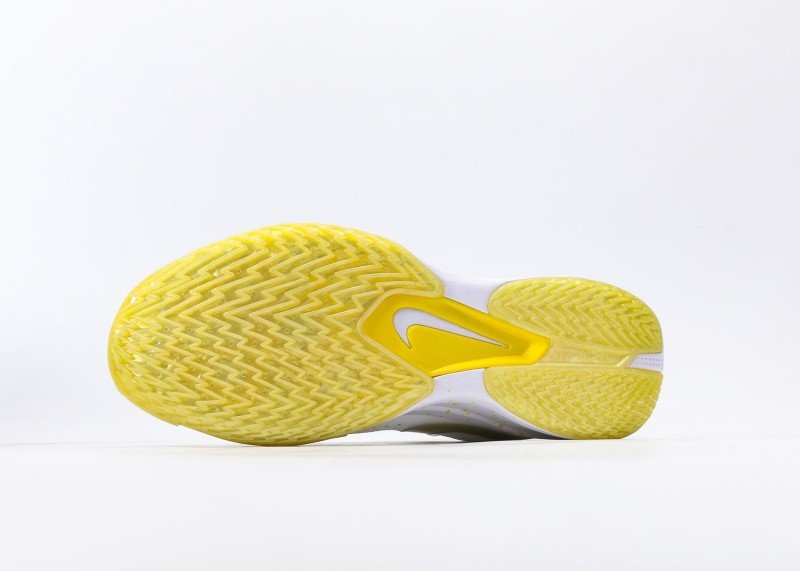 Transparent yellow forefoot sole with white rear section, “ZOOM” branding at midsole highlights cushioning technology, clear tread patterns for excellent traction.