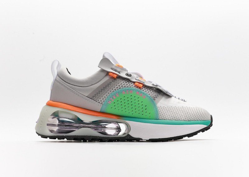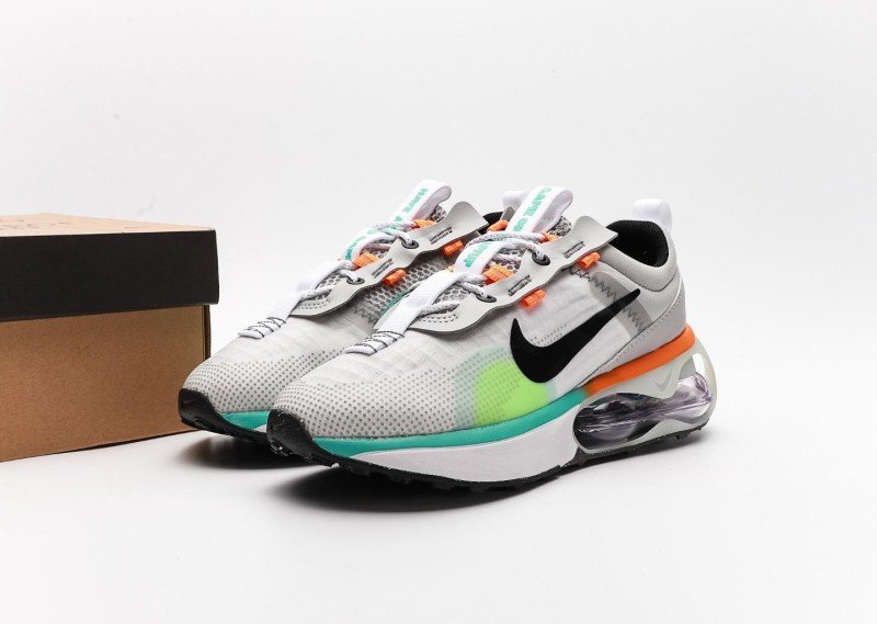 Nk Air Max 2021 features grey-green-orange gradient design, breathable mesh upper with black Swoosh logo, transparent Air Max cushion sole, blending sport and fashion.