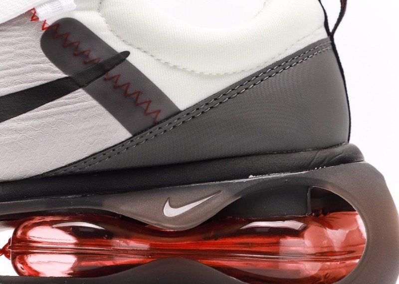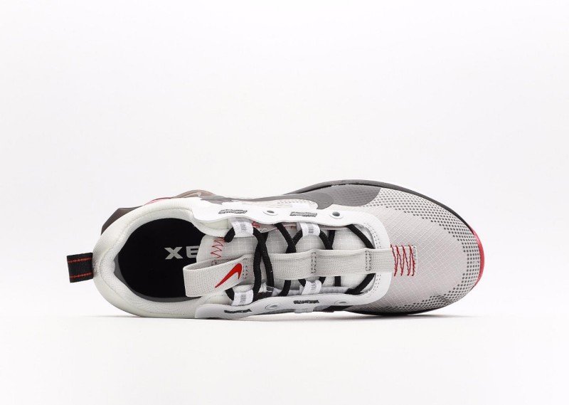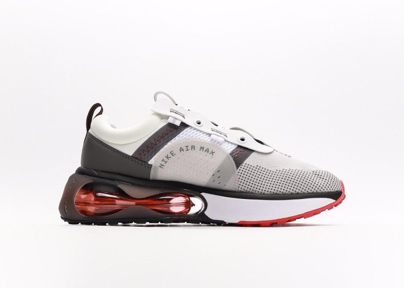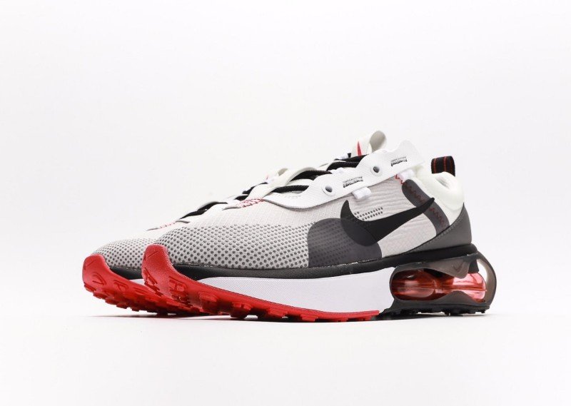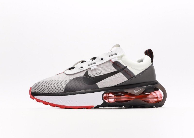 Nk Air Max 2021 features grey-white-red color blocking, breathable mesh upper with black Swoosh logo, rear red Air Max cushion, blending classic and modern design.
