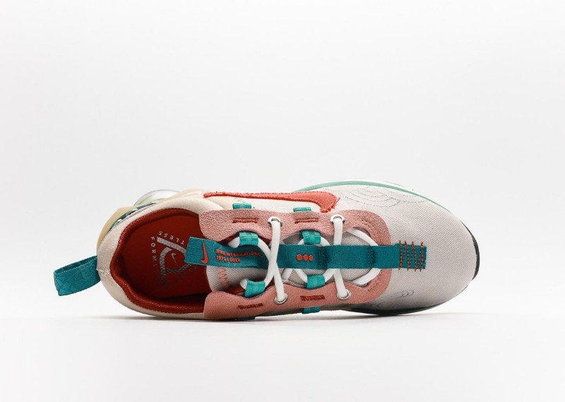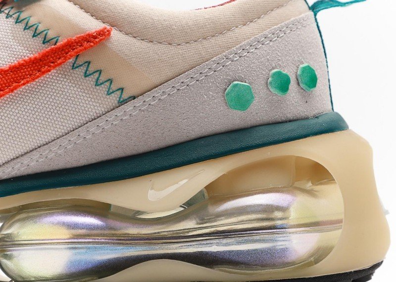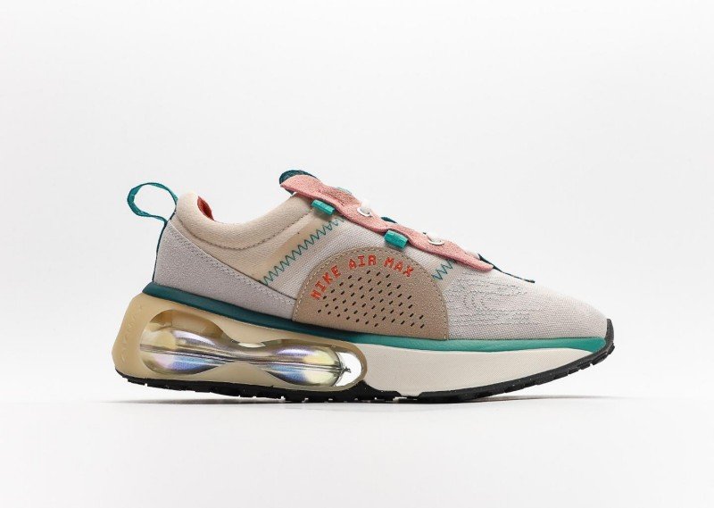 Nk Air Max 2021 features beige-orange-teal colorway, textile upper with orange Swoosh logo, rainbow transparent cushion sole, blending retro and modern design.