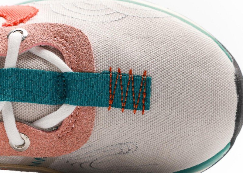 Beige textile upper with fine texture, teal lace holes and pull tabs add vitality, bold orange Swoosh, unique rainbow cushion visual effect, rich overall layers.