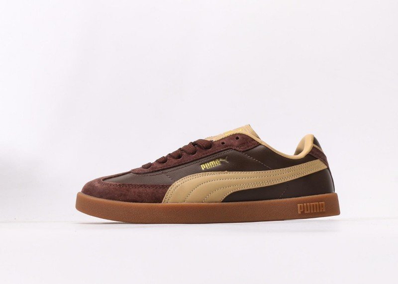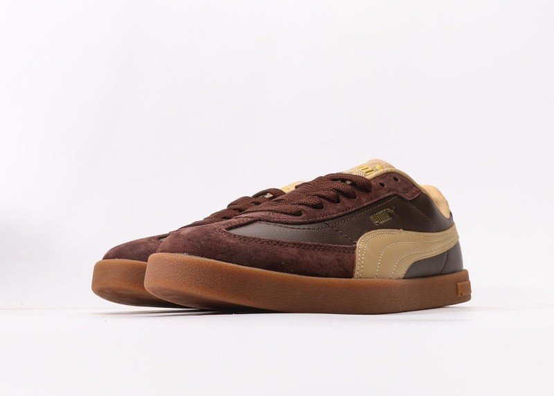 PUMA Club II Era features dark brown-beige colorblock, suede and leather combination, gold branding, anti-slip brown rubber outsole, 1:1 official packaging.