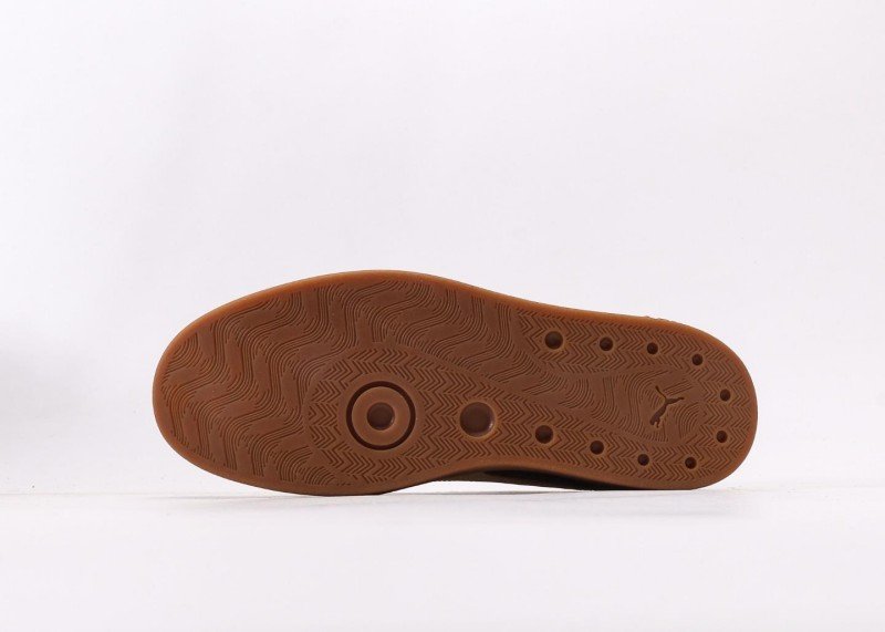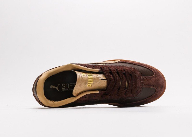 Premium dark brown suede with beige leather stripes, gold PUMA logo, embossed heel branding, white lacing system, identical to专柜 specifications.