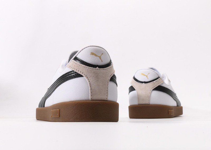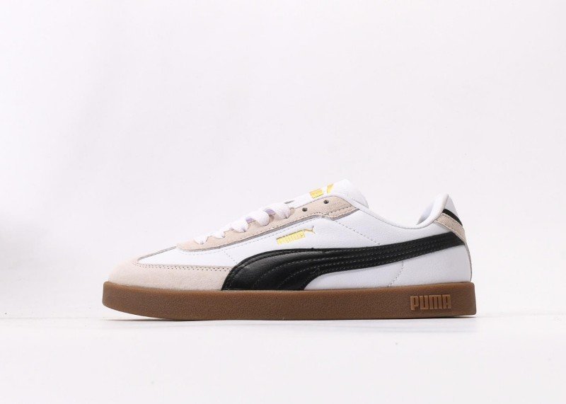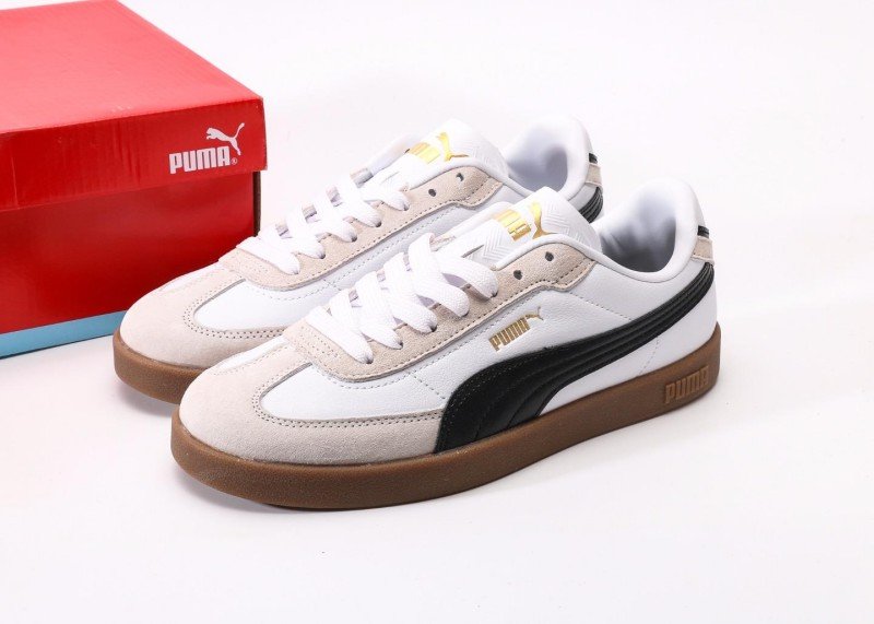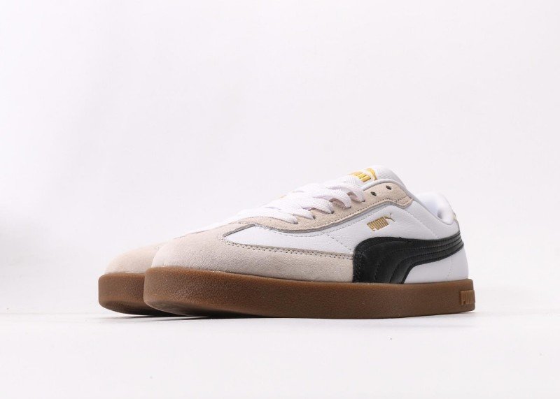 PUMA Club II Era features white-black-brown colorblock, white leather upper, black streamlined stripes, anti-slip brown rubber outsole, 1:1 official packaging.