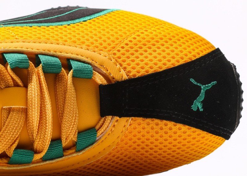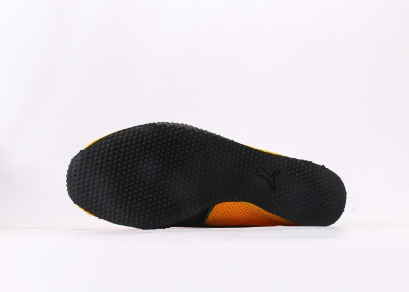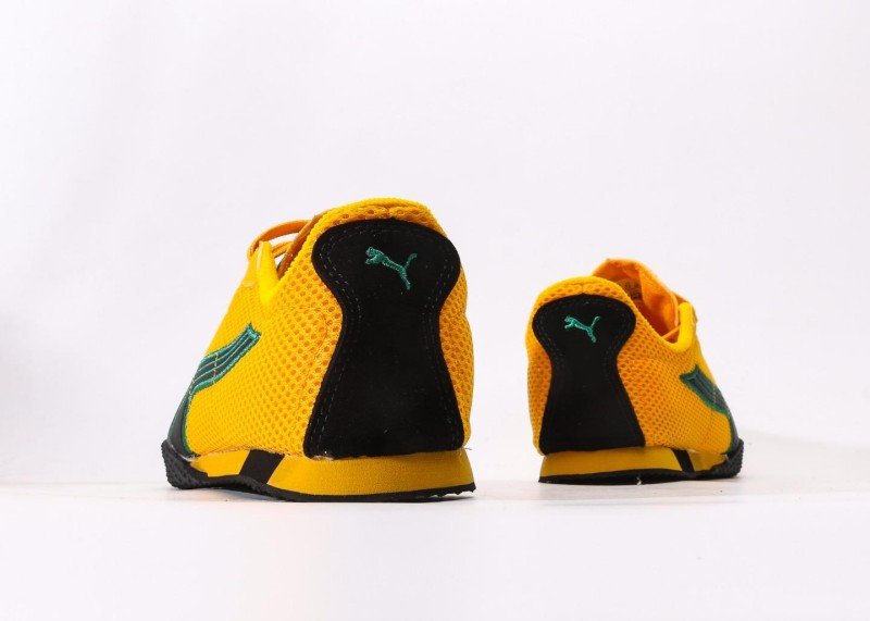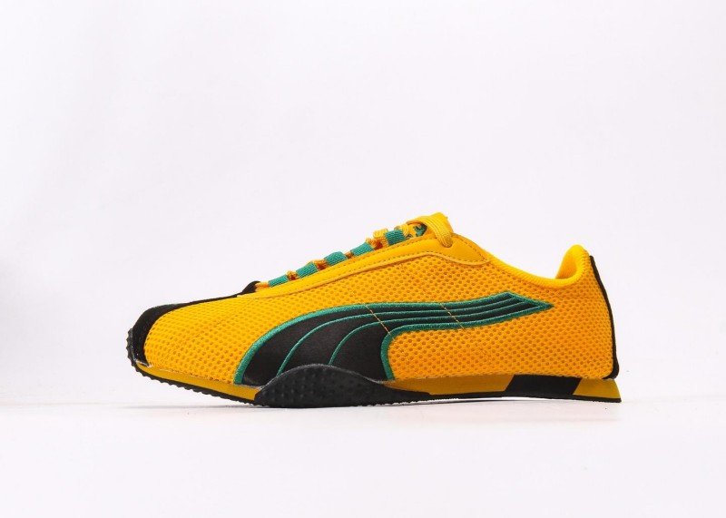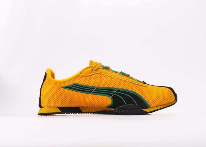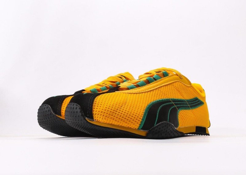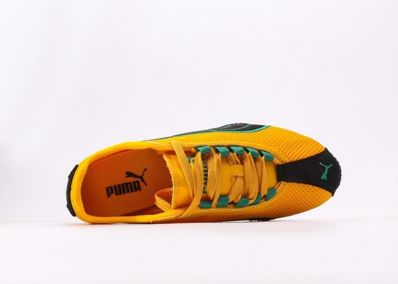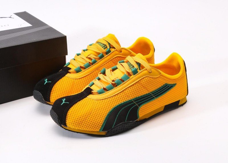 PUMA H-Street deconstructed training shoes feature yellow-black-green racing colorway, yellow mesh upper with green racing stripes, black PUMA logo, yellow-black laces, anti-slip rubber outsole, 1:1 official packaging.