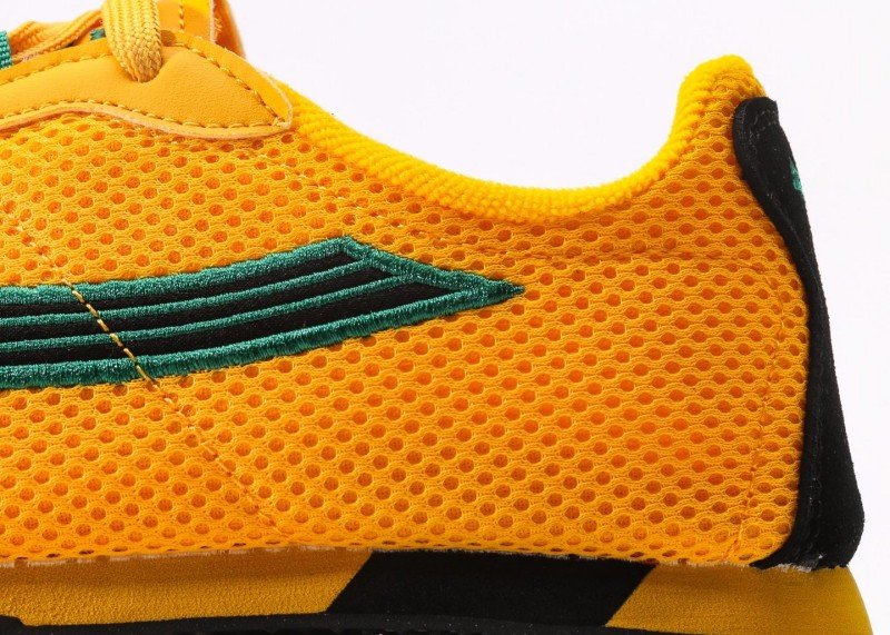 Breathable yellow mesh with green stripe detail, minimalist branding, low-top design for flexibility,identical to counter specifications.