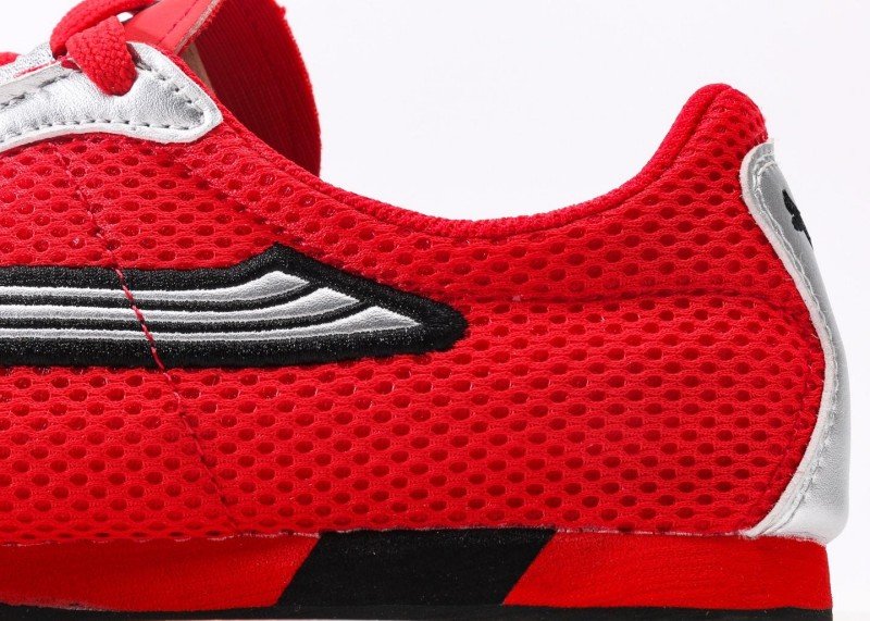Breathable red mesh with silver stripe detail, minimalist branding, low-top design for flexibility, identical to counter specifications.