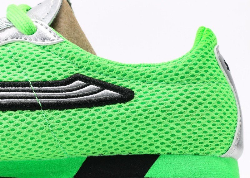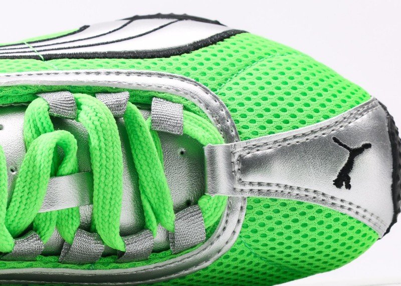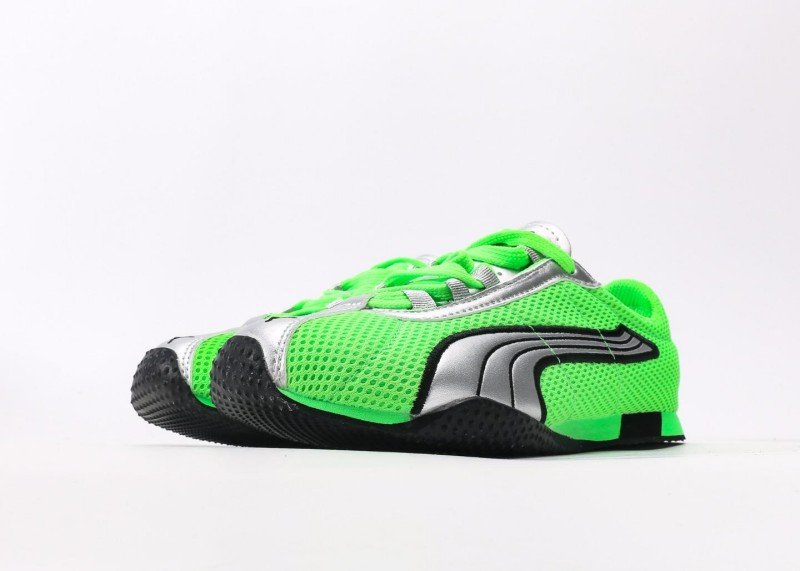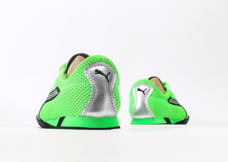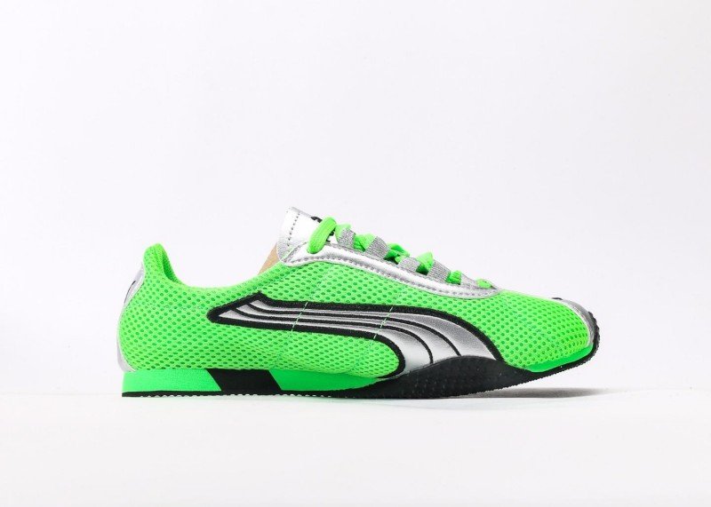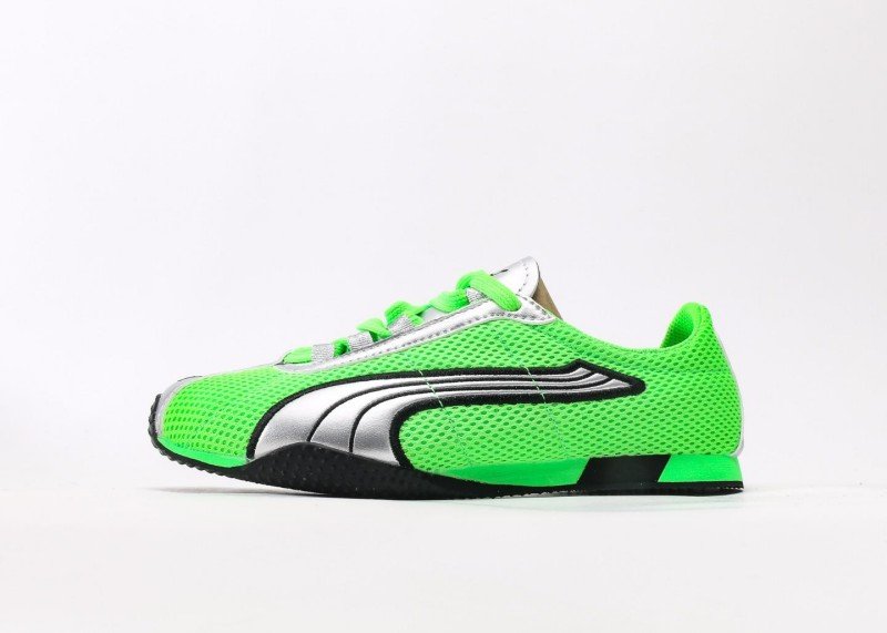 Puma H-Street OG features bright green mesh upper with silver accents and black signature stripes, replicating 90s street style. Low-top design for flexibility, breathable mesh suitable for all seasons.