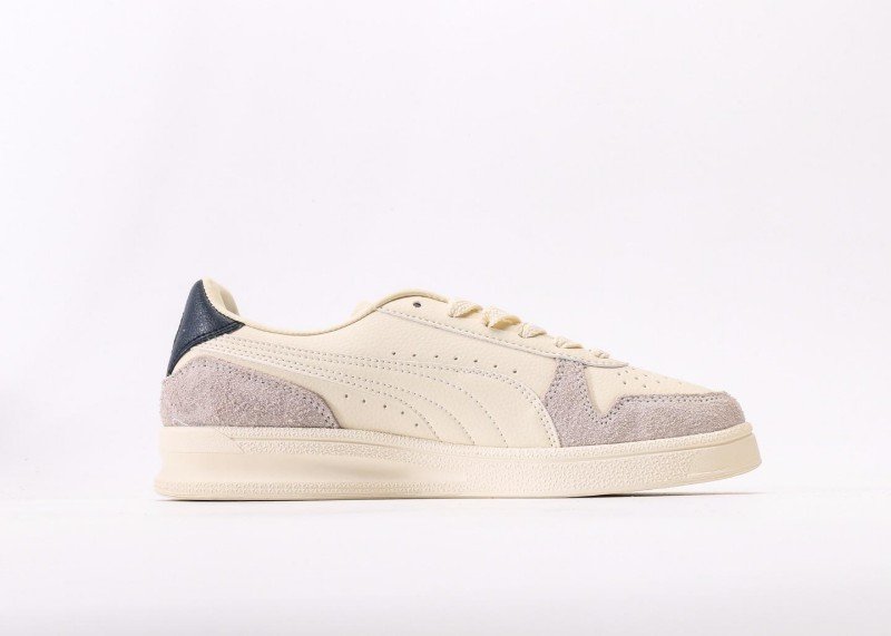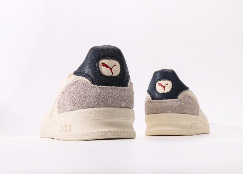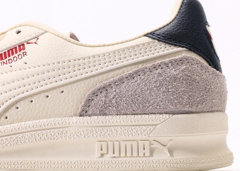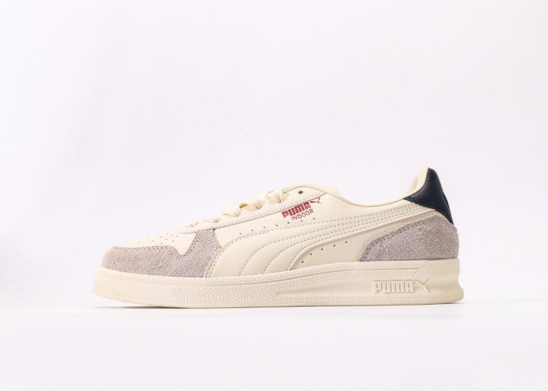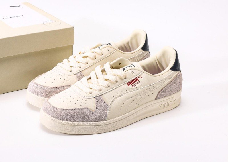 Puma Palermo Sophia features cream-gray-black colorblock, cream leather upper with light gray suede accents, black heel patch, red PUMA logo, anti-slip rubber outsole, 1:1 official packaging.