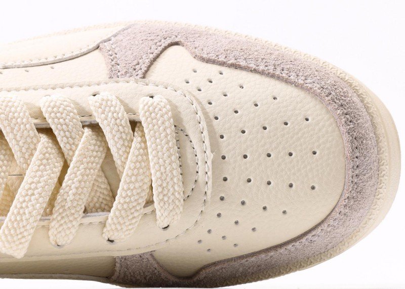 Premium cream leather with light gray suede overlays, black heel stabilizer, red branding, white midsole with light gray edge, identical to专柜 specifications.