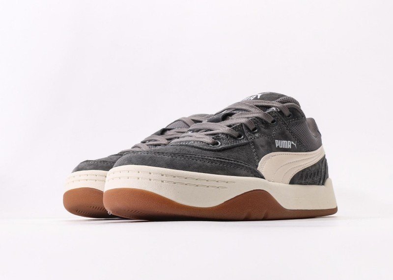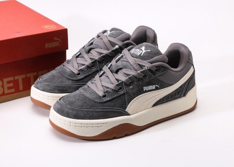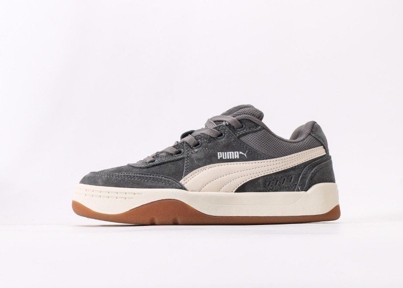 PUMA Slipstream Lo Laces features dark gray suede and mesh upper, off-white streamlined stripes, white PUMA logo, anti-slip brown rubber outsole, 1:1 official packaging.